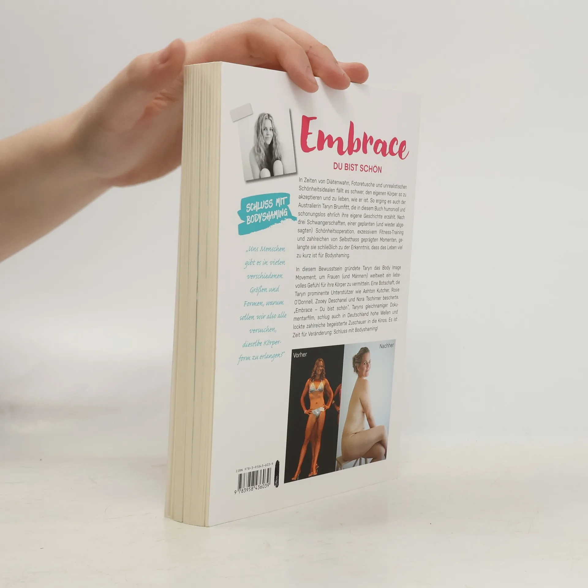 In Zeiten von Diätenwahn, Fotoretusche und unrealistischen Schönheitsidealen fällt es schwer, den eigenen Körper zu akzeptieren und zu lieben so wie er ist. Nicht anders erging es der Australierin Taryn Brumfitt, die sich jahrelang für alles andere als schön hielt. Nach einer geplanten (und wieder gecancelten) Schönheitsoperation, einer Body-Building-Karriere und zahlreichen von Selbsthass geprägten Momenten vor dem Spiegel kommt sie schließlich zu der Erkenntnis: Es ist nicht mein Körper, den ich ändern muss, sondern meine Einstellung zu mir selbst! In diesem Buch erzählt Taryn ihre ganze Geschichte, vollkommen ehrlich und ohne die Dinge zu beschönigen. Sie berichtet vom Verlust ihres Bruders, wie sie in der Schule gehänselt wurde und wie sie nach der Geburt ihres ersten Kindes erbittert gegen ihren eigenen Körper kämpft. Geistreich und durchaus humorvoll bringt sie auf den Punkt, warum das Leben viel zu kurz ist, um es mit Selbstzweifeln zu verbringen. Eine Botschaft, die den Nerv der Zeit trifft und Taryn prominente Unterstützer wie Ashton Kutcher, Rosie O'Donnell und Zooey Deschanel bescherte. In Zusammenarbeit mit der deutschen Schauspielerin Nora Tschirner drehte Taryn den „Embrace“-Dokumentarfilm, in welchem sie Bodyshaming den Kampf ansagt und im Gespräch mit den verschiedensten Frauen herauszufinden versucht, warum diese so überaus selbstkritisch mit ihren Körpern sind.