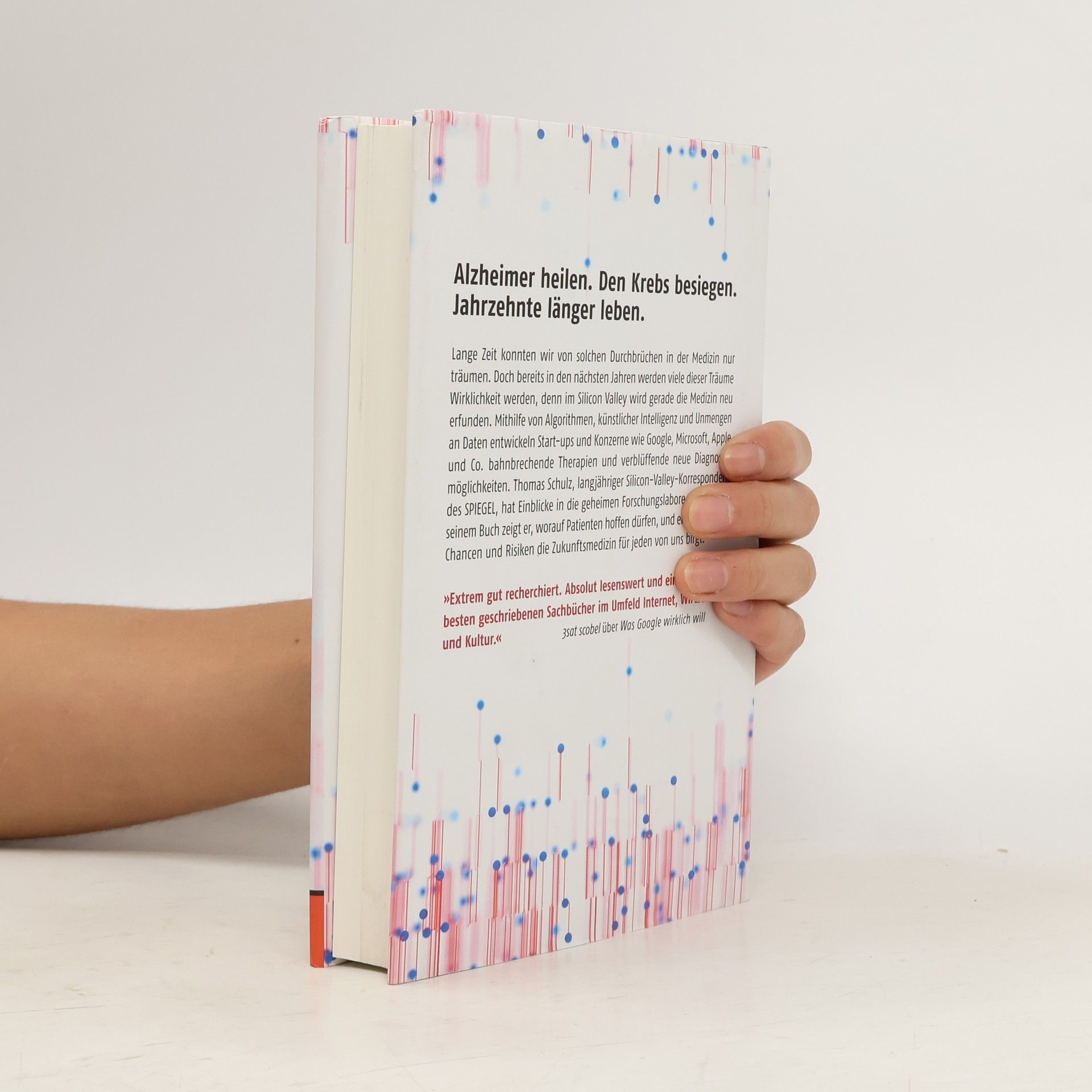 Alzheimer heilen. Den Krebs besiegen. Jahrzehnte länger leben. Lange Zeit konnten wir von solchen Durchbrüchen in der Medizin nur träumen. Doch bereits in den nächsten Jahren werden viele dieser Träume Wirklichkeit werden, denn im Silicon Valley wird gerade die Medizin neu erfunden. Mithilfe von Algorithmen, künstlicher Intelligenz und Unmengen an Daten entwickeln Start-ups und Konzerne wie Google, Microsoft, Apple und Co. bahnbrechende Therapien und verblüffende neue Diagnosemöglichkeiten. Thomas Schulz, langjähriger Silicon-Valley-Korrespondent des SPIEGEL, hat Einblicke in die geheimen Forschungslabore erhalten. In seinem Buch zeigt er, worauf Patienten hoffen dürfen, und erklärt, welche Chancen und Risiken die Zukunftsmedizin für jeden von uns birgt.