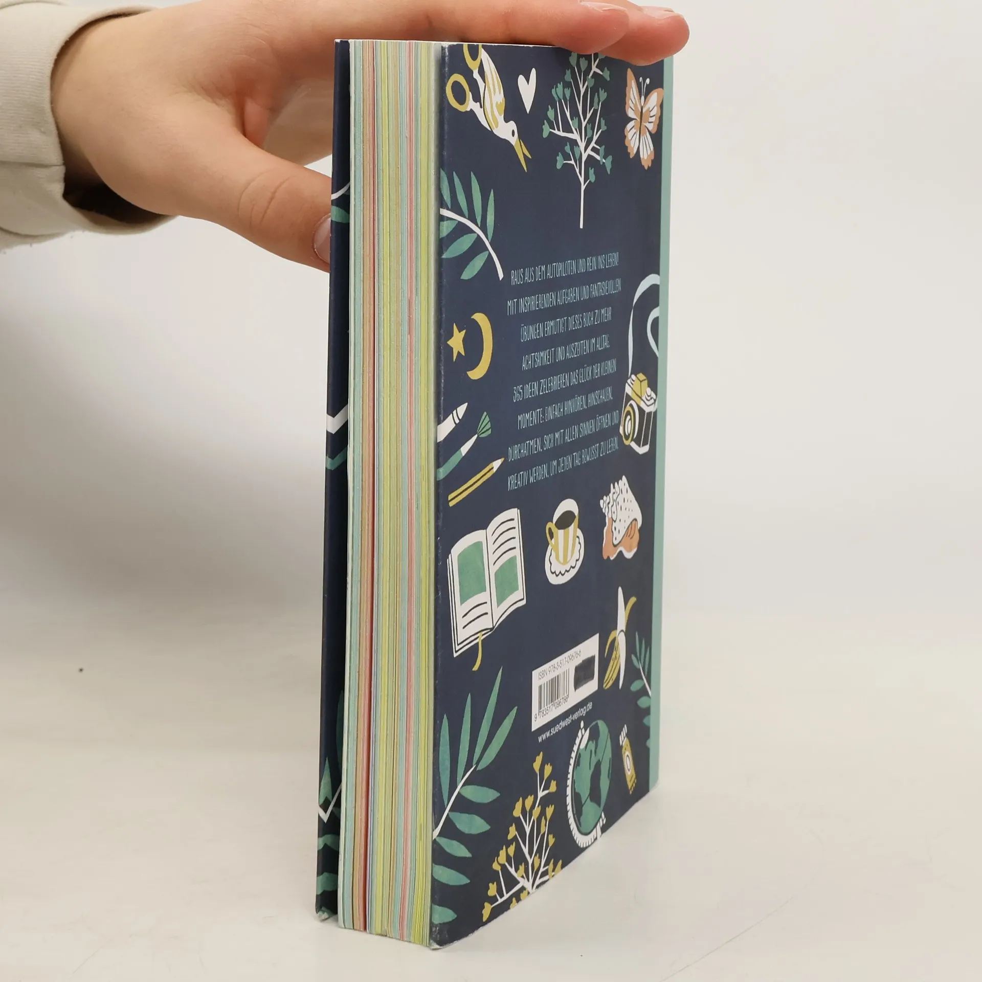 365 Tage Achtsamkeit und Kreativität Raus aus dem Autopiloten und rein ins Leben! Mit Augen öffnenden Anregungen, inspirierenden Aufgaben und fantasievollen Übungen, um das Hier und Jetzt zu erkunden, ermutigt dieses Buch zu mehr Achtsamkeit und Auszeiten im Alltag. 365 liebevoll illustrierte Ideen zelebrieren das Glück der kleinen Momente: Einfach hinhören, hinschauen, durchatmen, sich mit allen Sinnen öffnen, kreativ werden und den Kopf freimachen, um jeden Tag bewusst zu leben. Ausstattung: farbige Abbildungen