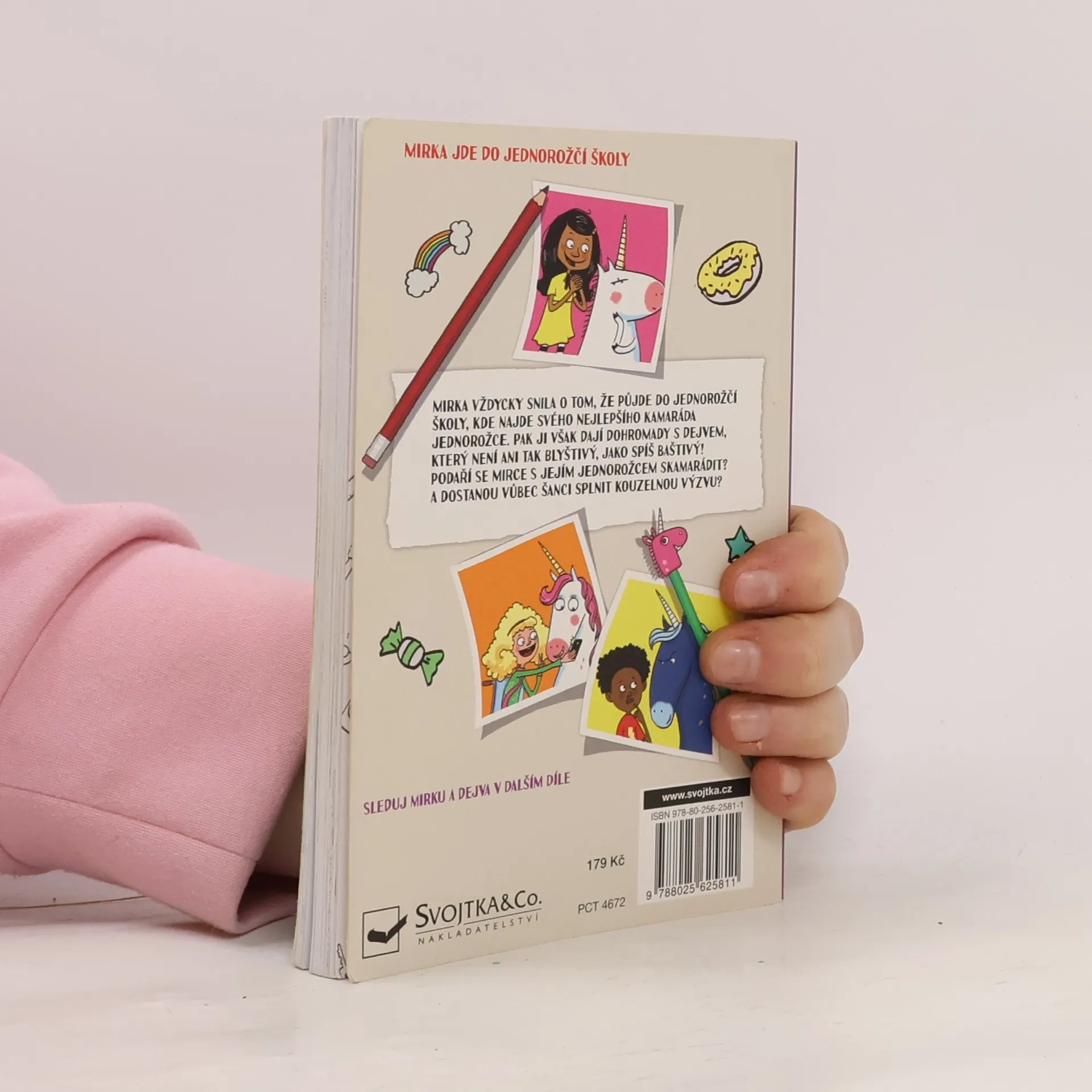 - Kam se jednorožec nikdy neschová? - Za roh. Mirka Duhajská je docela obyčejná holka, na kterou ale čeká neobyčejné dobrodružství. Dostala totiž pozvánku na Jednorožčí školu! Mirku toho rána, kdy otevřela zvací obálku, zaplavil pocit ohromného vzrušení odjakživa totiž snila o vlastním jednorožci. Když nadešel ten den a Mirka proletěla kouzelnou branou na parkovišti u zábavního parku a dopadla na přistávací stoh, byla rozhodnutá, že tohle bude nejbáječnější období v jejím životě. Jednorožčí škola s věžičkami a hodinovou věží tak trochu připomínala zámek a hned vedle stály stáje pro jednorožce. Mirka byla plná očekávání z toho, jakého jednorožce jí přidělí. Těšila se na svého nového jednorožčího kamaráda tak moc, až to bylo skoro k nevydržení. A pak se to stalo: na kouzelném svitku se objevilo jméno jejího jednorožčího parťáka: Dejv. Mirka nemohla uvěřit vlastním očím, když do sálu vpochodoval ten nejmenší a nejzavalitější jednorožec, jakého si dokážete představit. Mirka jen zírala. Měl trochu pupek a namísto hřívy spíš slámu, která trčela na všechny strany. Nerudně se mračil a ani trochu se netřpytil. Dokáže se Mirka spřátelit s tímto podivným jednorožcem? Jak je možné, že ji už od prvního dne ve škole provázejí jen samé problémy? Její nový parťák jí totiž pobyt v Jednorožčí škole vůbec neusnadňuje. Mirku tak čeká množství výzev, kterým se bude muset postavit čelem.