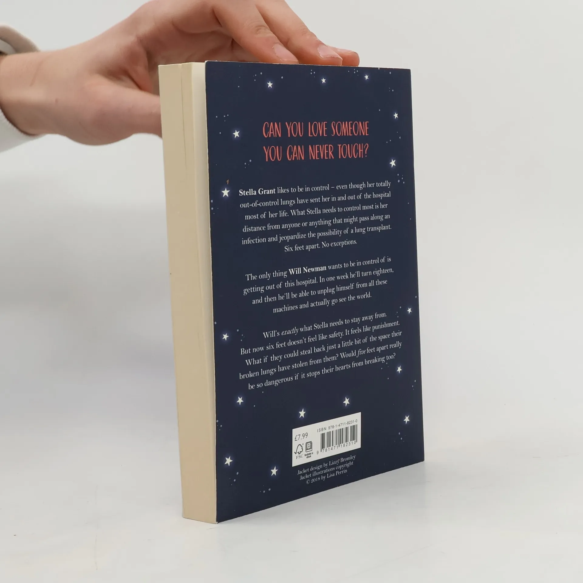 Can you love someone you can never touch ? Stella Grant likes to be in control - even though her totally out-of-control lungs have sent her in and out of the hospital most of her life. What Stella needs to control most is her distance from anyone or anything that might pass along an infection and jeopardize the possibility of a lung transplant. Six feet apart. No exceptions. The only thing Will Newman wants to be in control of is getting out of this hospital. In one week he'll turn eighteen, and then he'll be able to unplug himself from all these machines and actually go see the world. Will's exactly what Stella needs to stay away from. But now six feet doesn't feel like safety. It feels like punishment. What if they could steal back just a little bit of the space their broken lungs have stolen from them ? Would five feet apart really be so dangerous if it stops their hearts from breaking too ?