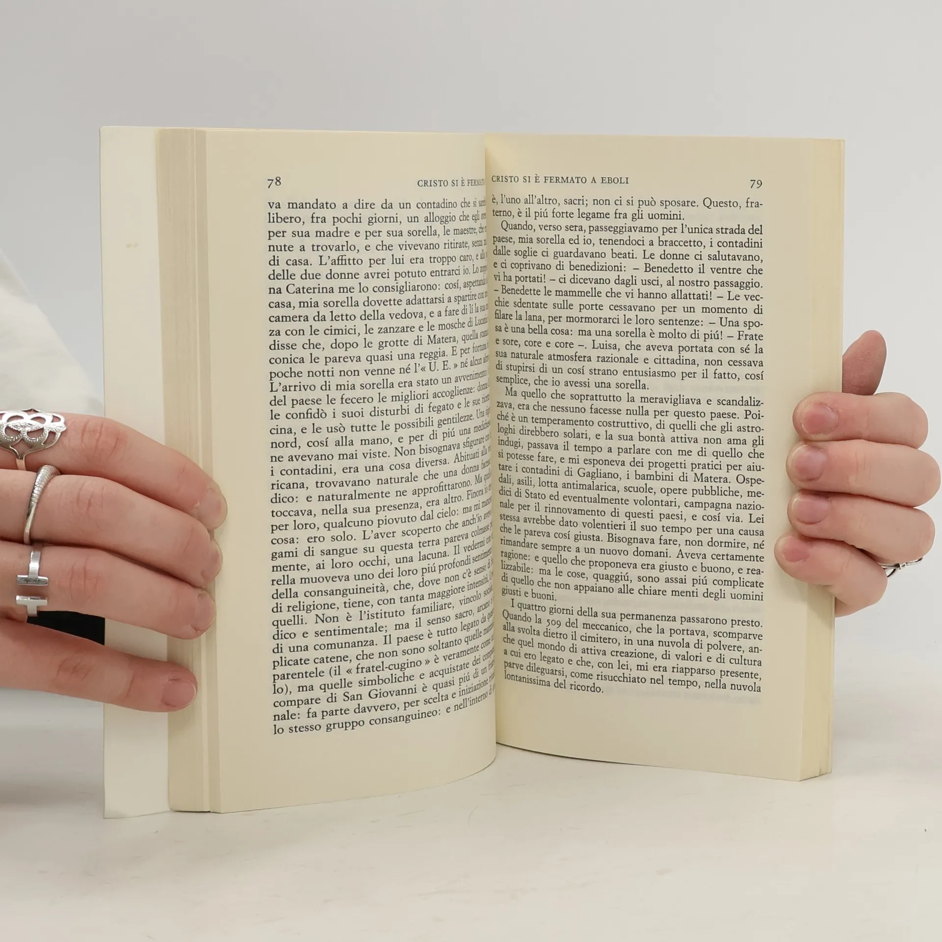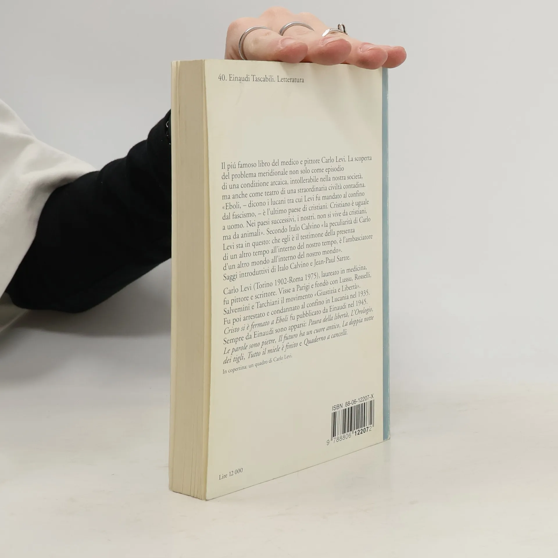 Il più famoso libro del medico e pittore Carlo Levi. La scoperta del problema meridionale non solo come episodio di una condizione arcaica, intollerabile nella nostra società, ma anche come teatro di una straordinaria civiltà contadina. «Eboli,--dicono i lucani tra cui Levi fu mandato al confino dal fascismo,--è l’ultimo paese di cristiani. Cristiano è uguale a uomo. Nei paesi successivi, i nostri, non si vive da cristiani, ma da animali». Secondo Italo Calvino «la peculiarità di Carlo Levi sta in questo: che egli è il testimone della presenza di un altro tempo all’interno del nostro tempo, è l’ambasciatore d’un altro mondo all’interno del nostro mondo». Saggi introduttivi di Italo Calvino e Jean-Paul Sartre.