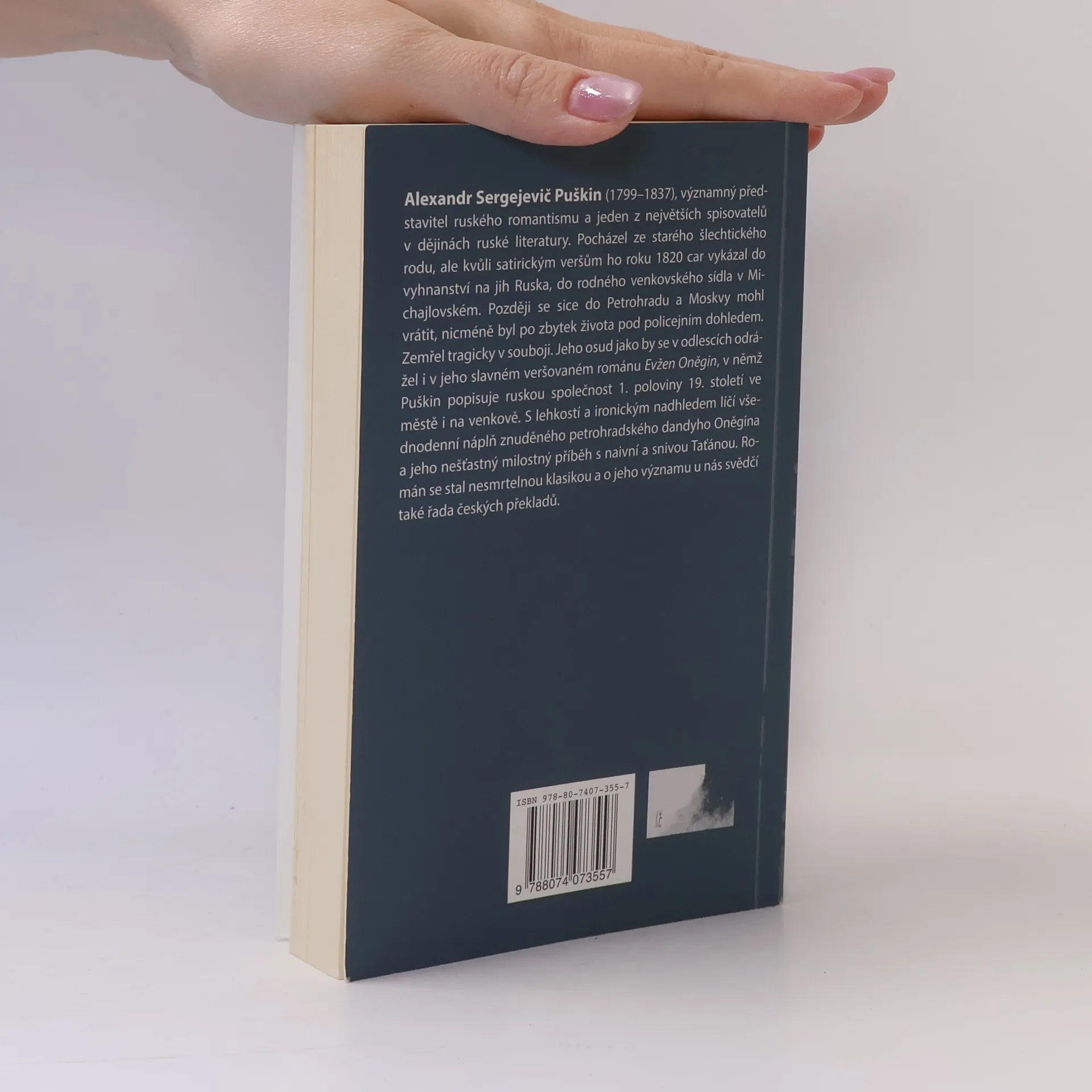 Puškin ve svém slavném veršovaném románu popisuje ruskou společnost 1. poloviny 19. století ve městě i na venkově. s lehkostí a ironickým nadhledem líčí všednodenní náplň znuděného petrohradského dandyho Oněgina a jeho nešťastný milostný příběh s naivní a snivou Táňou. Román se stal nesmrtelnou klasikou světové literatury.