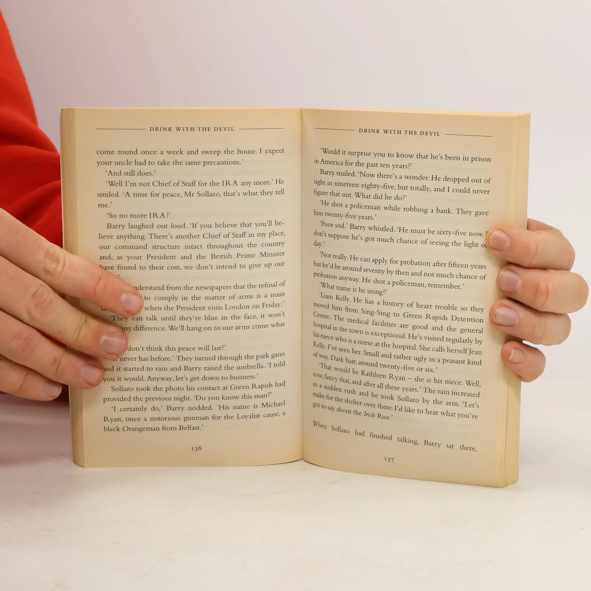 Drink with the Devil opens during 1985 off the northwest coast of England, where an audacious hijacking by Irish Protestant paramilitaries results in the disappearance of one hundred million pounds in gold bullion. The haul and hijackers are last known to be en route to Ireland on the seagoing barge Irish Rose, when it goes down in a fierce, sudden storm, leaving only two survivors - Michael Ryan, the mastermind behind the plot, and his mysterious accomplice, Martin Keogh. Ten years later, with the peace process faltering in Ireland, the president of the United States receives information about the whereabouts of the Irish Rose and her golden cargo - riches that may be used by terrorist powers to finance an Irish civil war. When an unexpected, sinister force becomes involved in the plot to retrieve the lost gold, it quickly becomes clear to British and American authorities that swift and desperate measures are necessary to resolve the crisis. Inspired by the old principle Set a thief to catch a thief, the British prime minister assigns the task to Sean Dillon - once the most feared IRA enforcer, now in the employ of British intelligence. Step by step, a deadly cat-and-mouse game unfolds, as increasing odds and old allies from a deadly past confront Dillon. Anything less than his complete success will be disastrous.