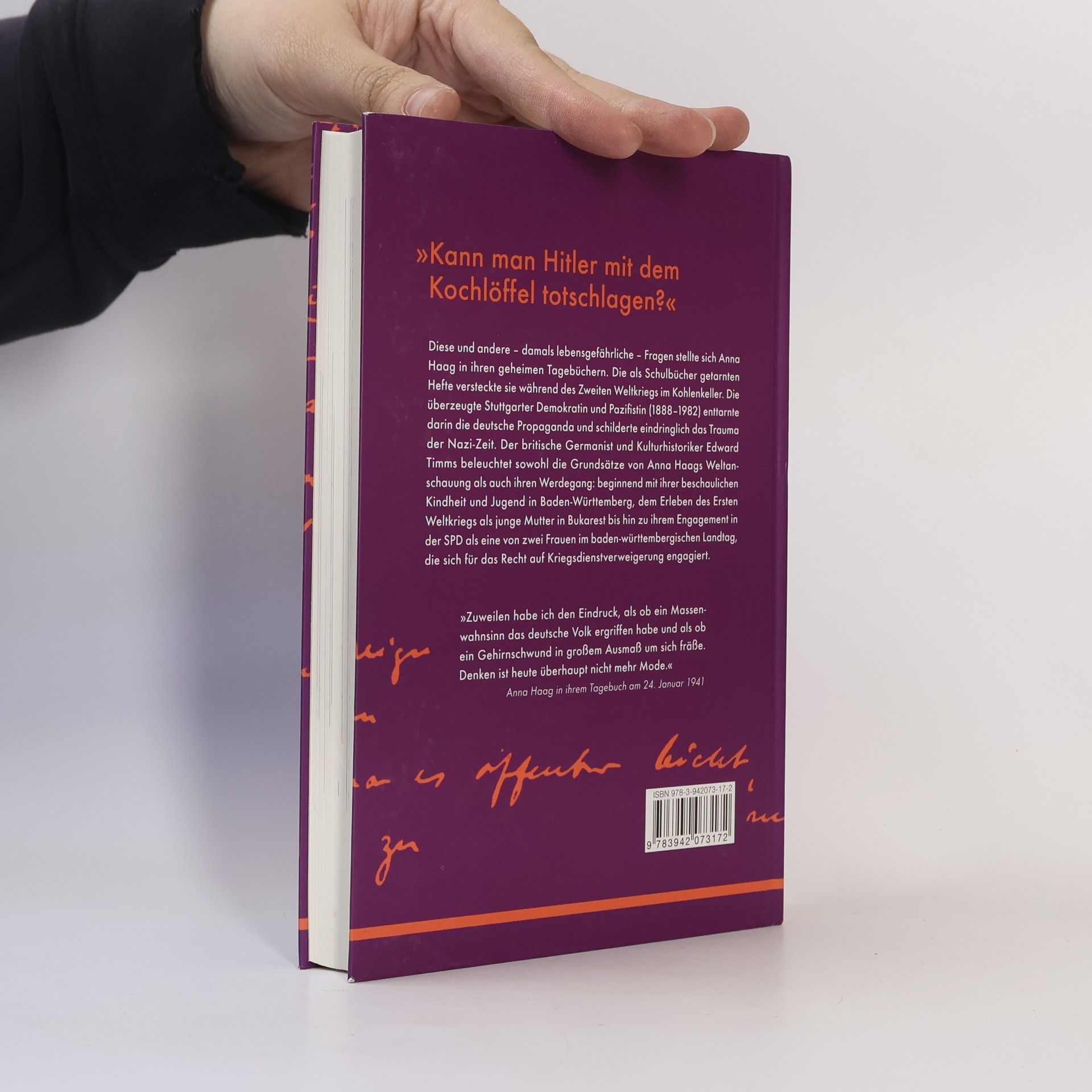 Die Stuttgarter Demokratin und Feministin Anna Haag (1888–1982) führte während des Zweiten Weltkriegs ein geheimes Tagebuch, in dem sie die deutsche Propaganda Tag für Tag dekonstruierte. In seiner faszinierenden Studie macht Edward Timms Ausschnitte des zwanzig Bände umfassenden Tagebuchs zum ersten Mal einer breiten Öffentlichkeit zugänglich und liefert eine Analyse dieser zeitgenössischen Quelle zum Alltag im Dritten Reich. Der bedeutende englische Germanist und Kulturhistoriker beleuchtet die Grundsätze von Anna Haags Weltanschauung und ihren Werdegang: Sie verbrachte eine beschauliche Kindheit und Jugend in Baden-Württemberg und erlebte den Ersten Weltkrieg als junge Mutter in Budapest. Diese prägenden Erfahrungen ließ sie von Beginn an den Nationalsozialismus kritisch hinterfragen und ihr Kriegstagebuch beginnen. Timms setzt faszinierende Passagen aus Haags Tagebüchern in Zusammenhang zu Zitaten aus weiteren Kriegstagebüchern, von Sympathisantinnen wie Kritikerinnen, Zeitungsartikeln und Rundfunkbeiträgen. Seine Collage illustriert ein vielfältiges Meinungsbild der damaligen Gesellschaft. Anna Haags Kritik an der Nazi-Tyrannei und ihr Engagement in der SPD beim demokratischen Wiederaufbau nach dem Krieg sind maßgeblich dafür verantwortlich, dass im Grundgesetz der Bundesrepublik Deutschland das Recht zur Kriegsdienstverweigerung festgeschrieben steht.