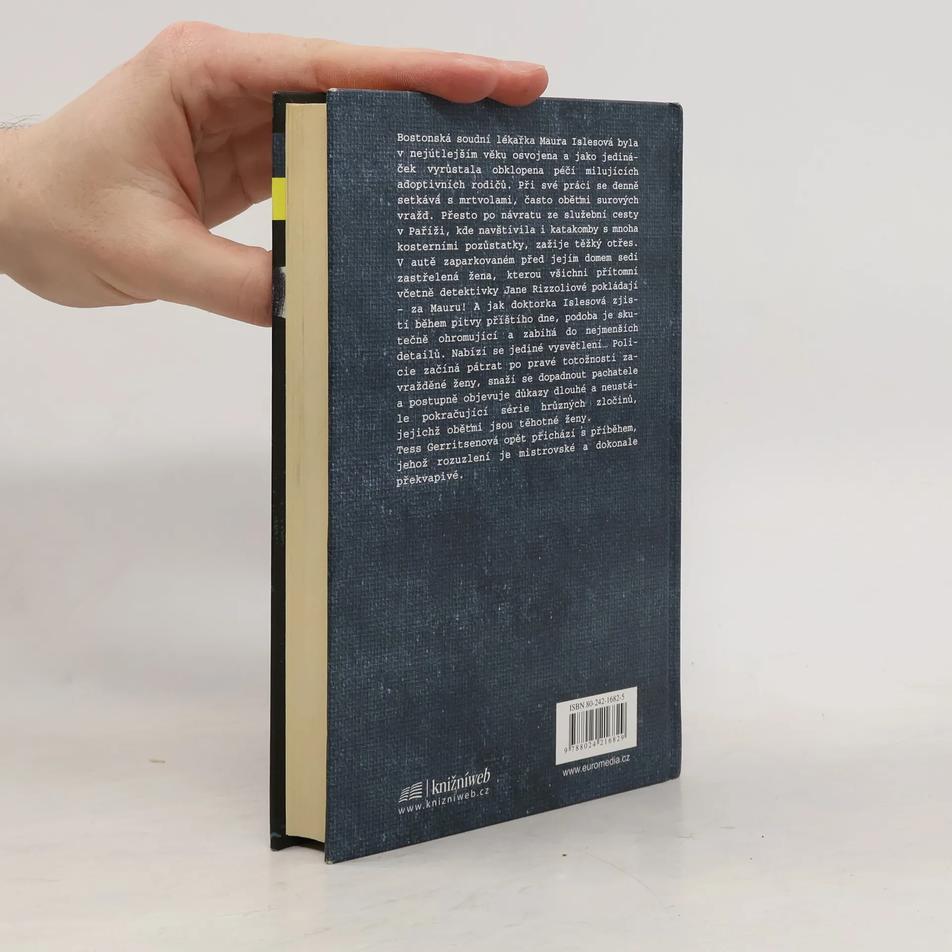 Bostonská soudní lékařka Maura Islesová byla v nejútlejším věku osvojena a jako jedináček vyrůstala obklopena péčí milujících adoptivních rodičů. Při své práci se denně setkává s mrtvolami, často oběťmi surových vražd. Přesto po návratu ze služební cesty v Paříži, kde navštívila i katakomby s mnoha kosterními pozůstatky, zažije těžký otřes. V autě zaparkovaném před jejím domem sedí zastřelená žena, kterou všichni přítomní včetně detektivky Jane Rizzoliové pokládají - za Mauru! A jak doktorka Islesová zjistí během pitvy příštího dne, podoba je skutečně ohromující a zabíhá do nejmenších detailů. Nabízí se jediné vysvětlení Policie začíná pátrat po pravé totožnosti zavražděné ženy, snaží se dopadnout pachatele a postupně objevuje důkazy dlouhé a neustále pokračující série hrůzných zločinů, jejichž oběťmi jsou těhotné ženy. Tess Gerritsenová opět přichází s příběhem, jehož rozuzlení je mistrovské a dokonale překvapivé.... celý text