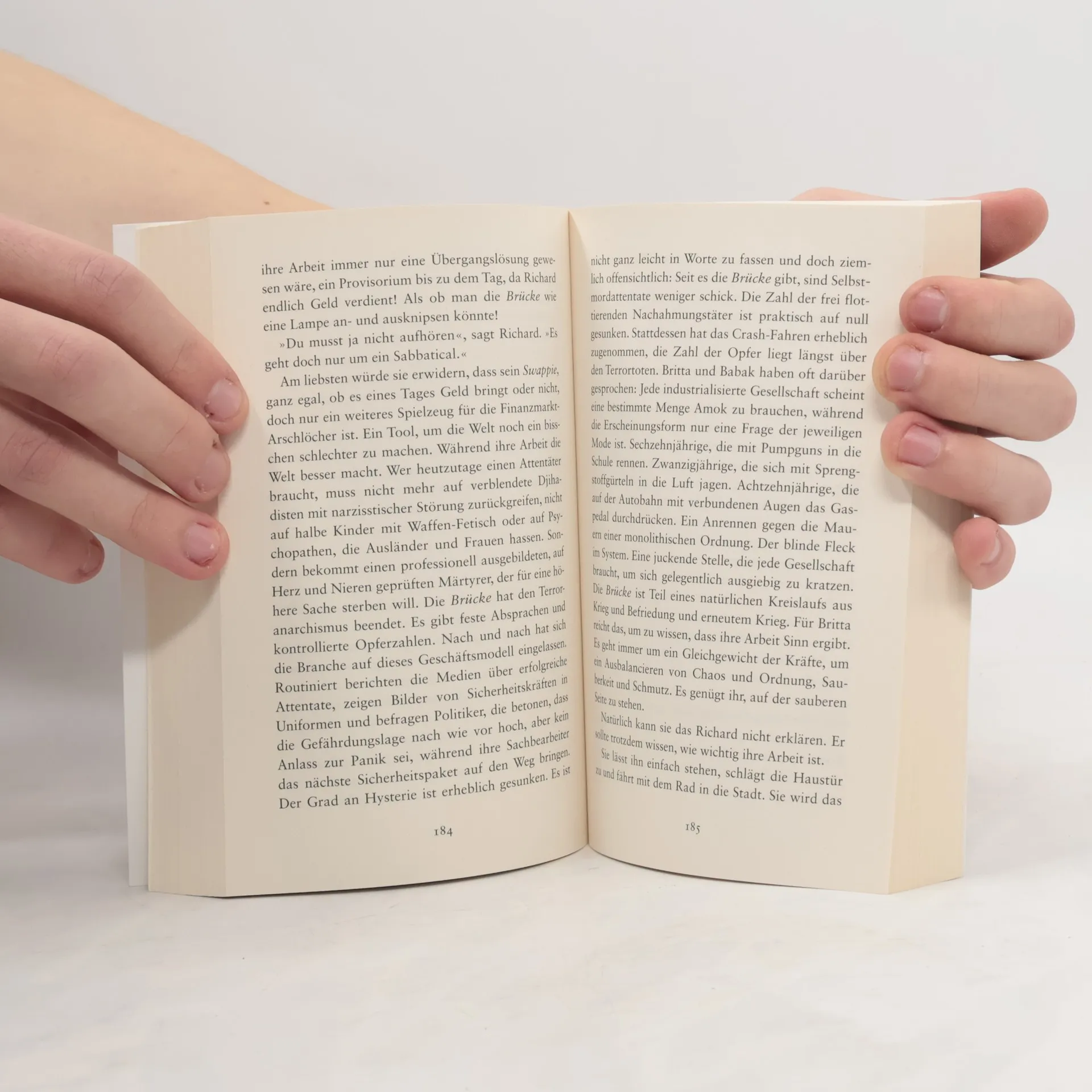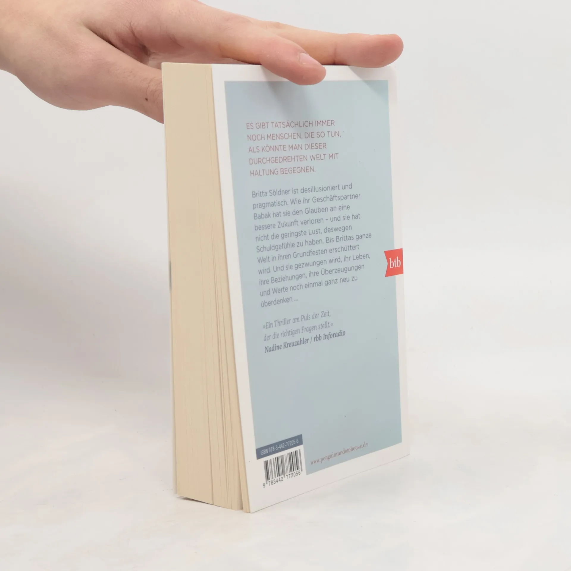 Britta Söldner ist desillusioniert und pragmatisch. Sie sieht die Dinge glasklar und hat den Zynismus der Politik genauso durchschaut wie das kleinbürgerliche Gutmenschentum, das die Welt keinen Deut besser macht. Wie ihr Geschäftspartner Babak hat sie den Glauben an eine bessere Zukunft verloren – und sie hat nicht die geringste Lust, deswegen Schuldgefühle zu haben. Bis Brittas ganze Welt in ihren Grundfesten erschüttert wird. Und sie gezwungen ist, ihr Leben, ihre Beziehungen, ihre Überzeugungen und Werte noch einmal ganz neu zu überdenken.