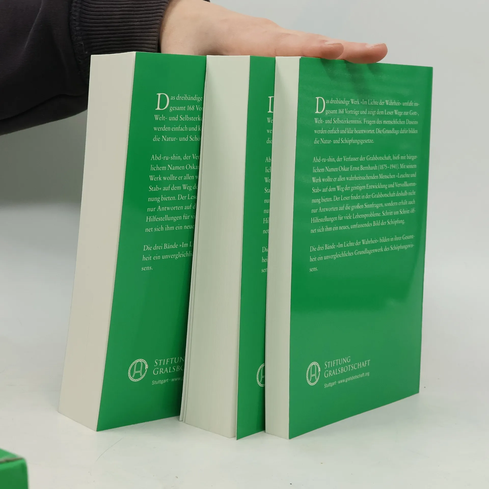 Das dreibändige Werk »Im Lichte der Wahrheit – Gralsbotschaft« von Abd-ru-shin ist eine zeitlose Erkenntnisquelle. Die 168 Vorträge erschließen dem Leser die großen Sinnzusammenhänge in der Schöpfung: Leben und Tod, Schicksal und Reinkarnation, Diesseits und Jenseits. Die Erklärungen des Werkes »Im Lichte der Wahrheit« bauen auf der Grundlage einfacher, verständlicher Naturgesetze auf, die in der Außenwelt ebenso wirksam sind wie im seelischen Innenleben. Sie sprechen typisch menschliche Erfahrungen an, zeigen Stärken und Schwächen auf und weisen auf verborgene Unzulänglichkeiten hin – aber auch auf die vielen Gelegenheiten, die das tägliche Leben für den geistigen Fortschritt bietet. Der Leser hat damit die Möglichkeit, den Inhalt der Vorträge im eigenen Leben wiederzuentdecken und als wahr zu erkennen.