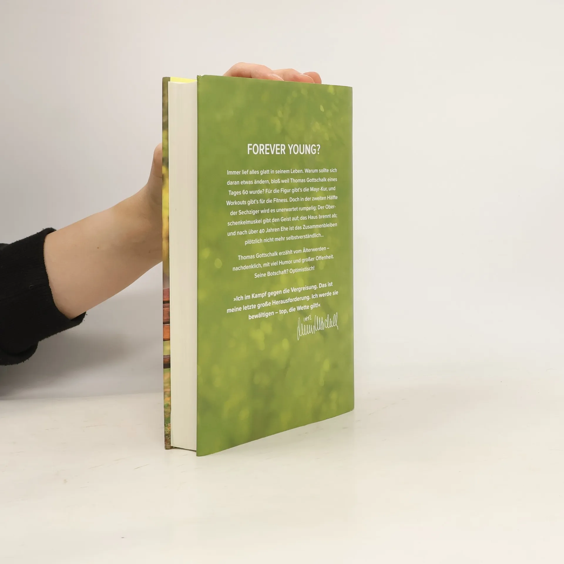 Forever young? Immer lief alles glatt in seinem Leben. Warum sollte sich daran etwas ändern, bloß weil Thomas Gottschalk eines Tages 60 wurde? Für die Figur gibt’s die Mayr-Kur, und Workouts gibt’s für die Fitness. Doch in der zweiten Hälfte der Sechziger wird es unerwartet rumpelig: Der Oberschenkelmuskel gibt den Geist auf; das Haus brennt ab; und nach über 40 Jahren Ehe ist das Zusammenbleiben plötzlich nicht mehr selbstverständlich… Thomas Gottschalk erzählt vom Älterwerden – nachdenklich, mit viel Humor und großer Offenheit. Seine Botschaft? Optimistisch! »Ich im Kampf gegen die Vergreisung. Das ist meine letzte große Herausforderung. Ich werde sie bewältigen – top, die Wette gilt!« Thomas Gottschalk