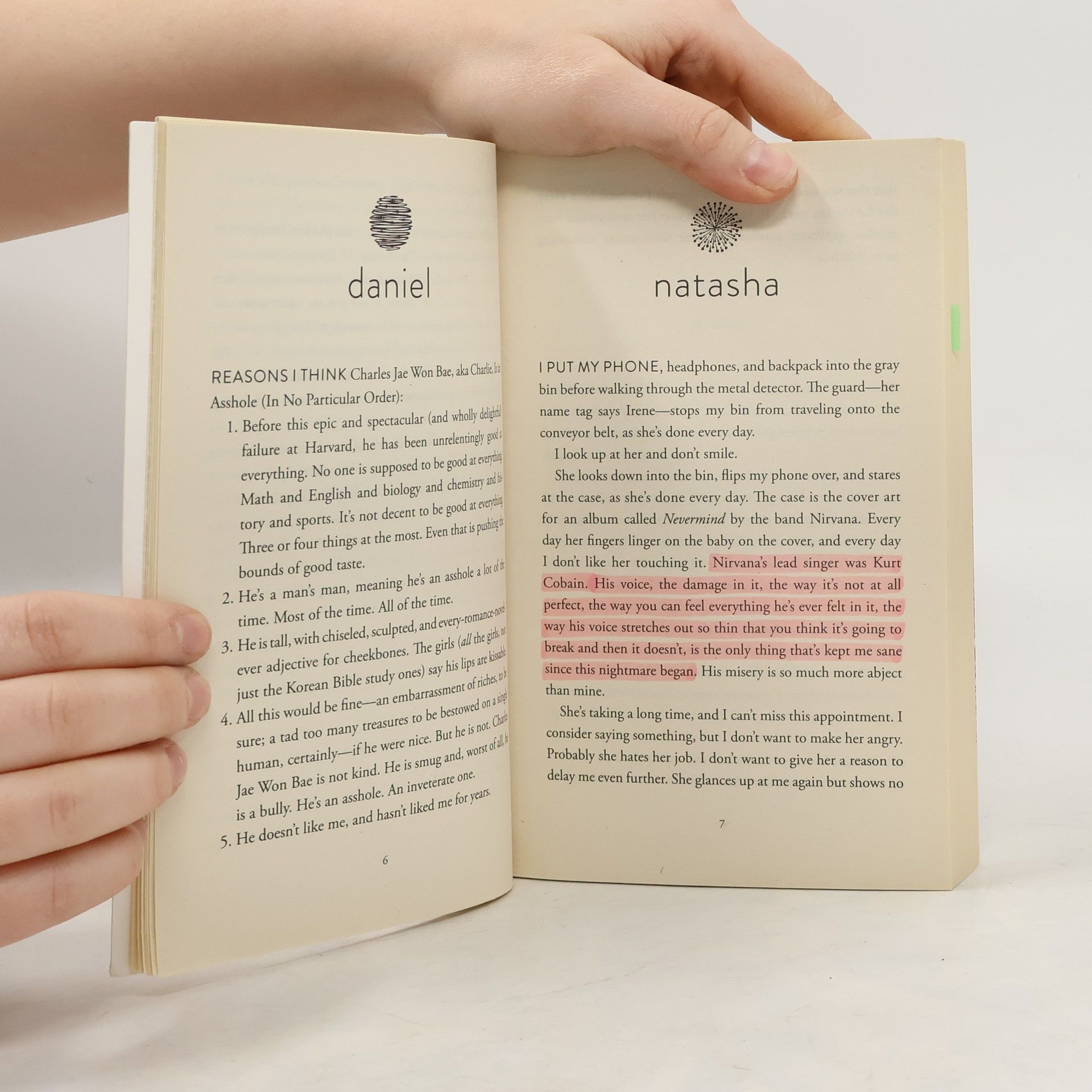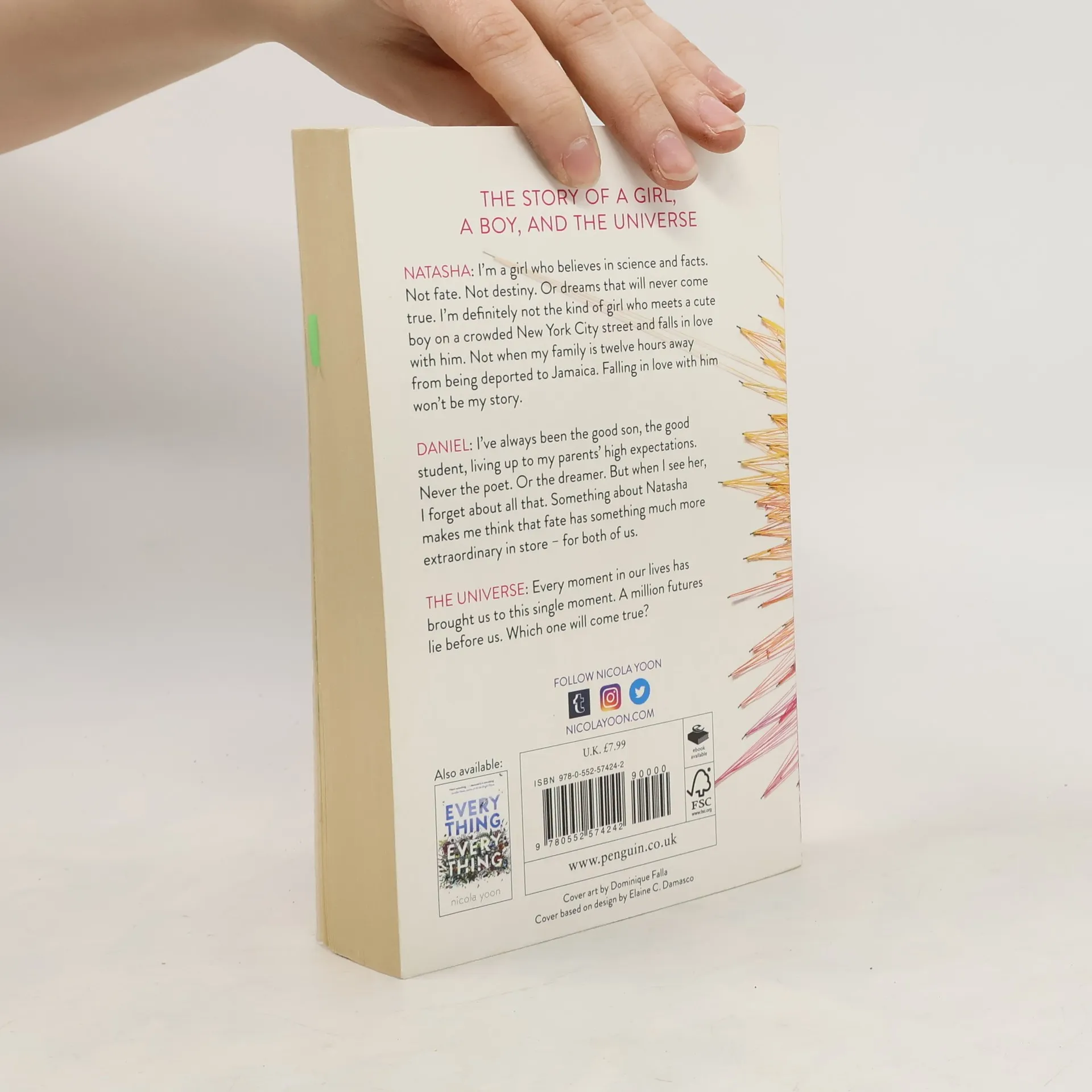 The dazzling new novel from Nicola Yoon, the New York Times bestselling author of Everything, Everything Natasha: I'm a girl who believes in science and facts. Not fate. Not destiny. Or dreams that will never come true. I'm definitely not the kind of girl who meets a cute boy on a crowded New York City street and falls in love with him. Not when my family is twelve hours away from being deported to Jamaica. Falling in love with him won't be my story. Daniel: I've always been the good son, the good student, living up to my parents' high expectations. Never the poet. Or the dreamer. But when I see her, I forget about all that. Something about Natasha makes me think that fate has something much more extraordinary in store-for both of us. The Universe: Every moment in our lives has brought us to this single moment. A million futures lie before us. Which one will come true?