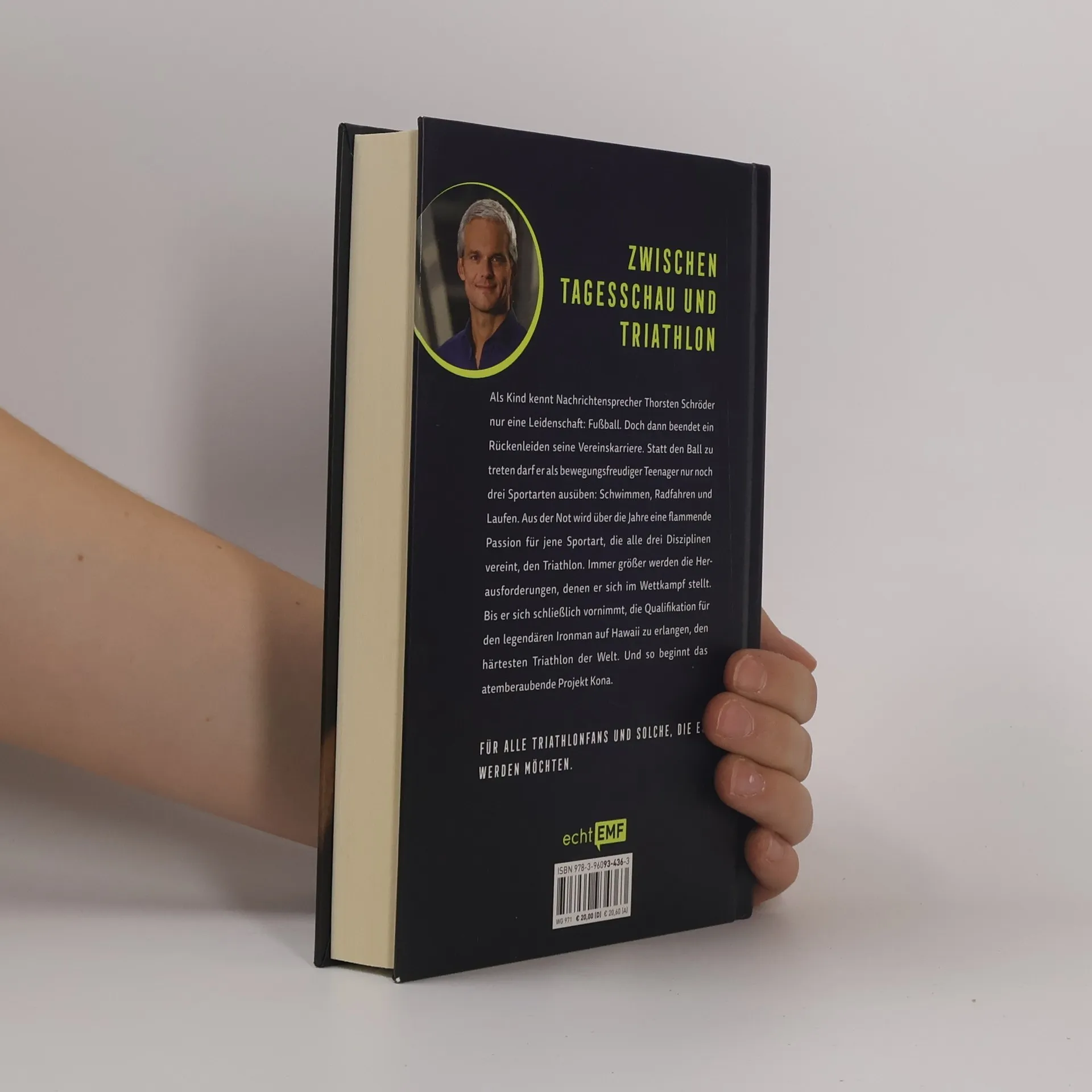 Zwischen Tagesschau und Triathlon Als Kind kennt Nachrichtensprecher Thorsten Schröder nur eine Leidenschaft: Fußball. Doch dann beendet ein Rückenleiden seine Vereinskarriere. Statt den Ball zu treten darf er als bewegungsfreudiger Teenager nur noch drei Sportarten ausüben: Schwimmen, Radfahren und Laufen. Aus der Not wird über die Jahre eine flammende Passion für jene Sportart, die alle drei Disziplinen vereint, den Triathlon. Immer größer werden die Herausforderungen, denen er sich im Wettkampf stellt, immer härter sein Training. Bis er sich schließlich vornimmt, die Qualifikation für den legendären Ironman Hawaii zu erlangen, den härtesten Triathlon der Welt. Und so beginnt das atemberaubende Projekt Kona. Motivation für jeden, der die sportliche Herausforderung sucht, für eine Langdistanz trainiert, einen Marathon schaffen möchte, am Trainingsplan feilt - und Unterhaltung für all die, die Sport lieber passiv genießen.
