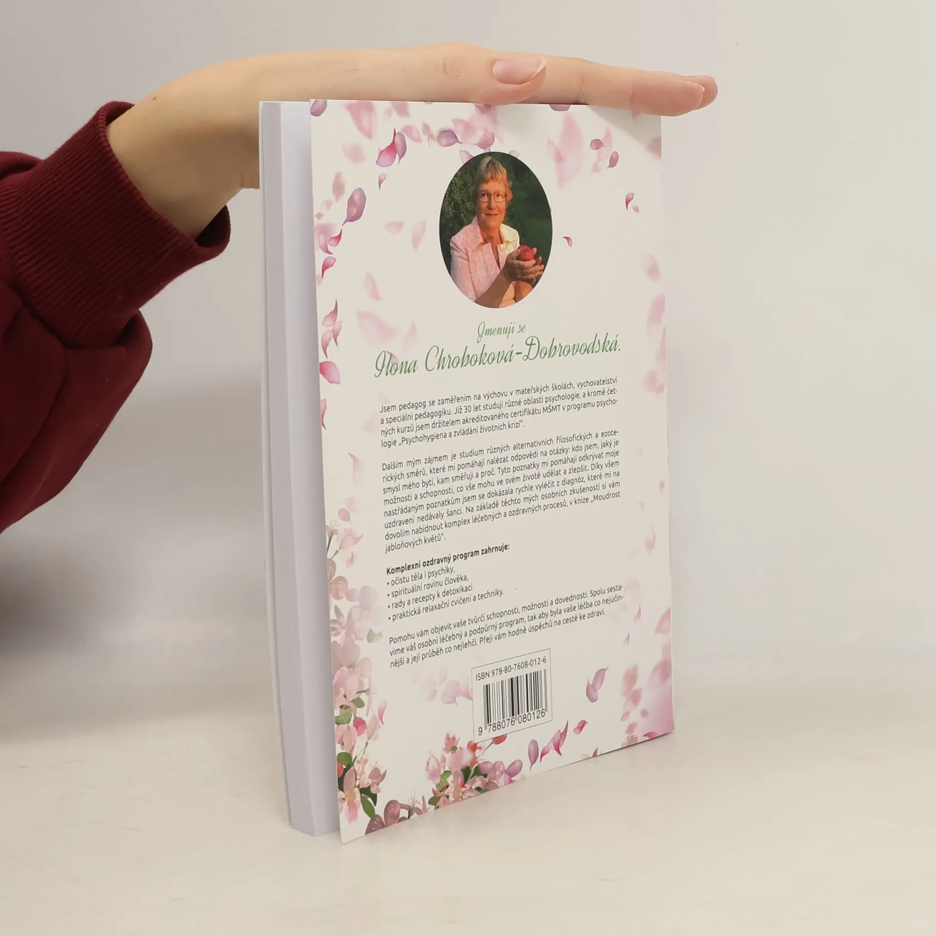Kniha Moudrost jabloňových květů vznikla na základě autorčiny vlastní zkušenosti s těžkým onkologickým onemocněním. Autorka, Bc. Ilona Dobrovodská, speciální pedagog, pedagog volného času, učitelka mateřských škol, se dlouhodobě zabývá studiem psychologie, filozofie, duchovních nauk a alternativní medicíny. Díky poznatkům z těchto oborů sestavila Komplexní ozdravný program. Spojila svůj ozdravný program s medicínskou léčbou a přispěla tak k vlastnímu uzdravení z takové diagnózy, jakou je rakovina ve stádiu masivních metastáz. Tento program obsahuje očistu těla i psychiky, cvičení, techniky, relaxace, vizualizace, jídelníček a rady a recepty. Naučí vás, jak si můžete sami účinně a láskyplně pomoci v období těžké nemoci, nebo životní krize. Systém je aplikovatelný na jakékoli onemocnění. Díky široké nabídce technik, rad a cvičení vám autorka nabídne možnost, sestavit si vlastní program léčení tak, aby vám co nejvíce vyhovoval a vaše léčba byla co nejúčinnější a nejkratší. Pomůže vám objevit vaše tvůrčí schopnosti a dovednosti. Přeji vám hodně úspěchů na cestě ke zdraví.