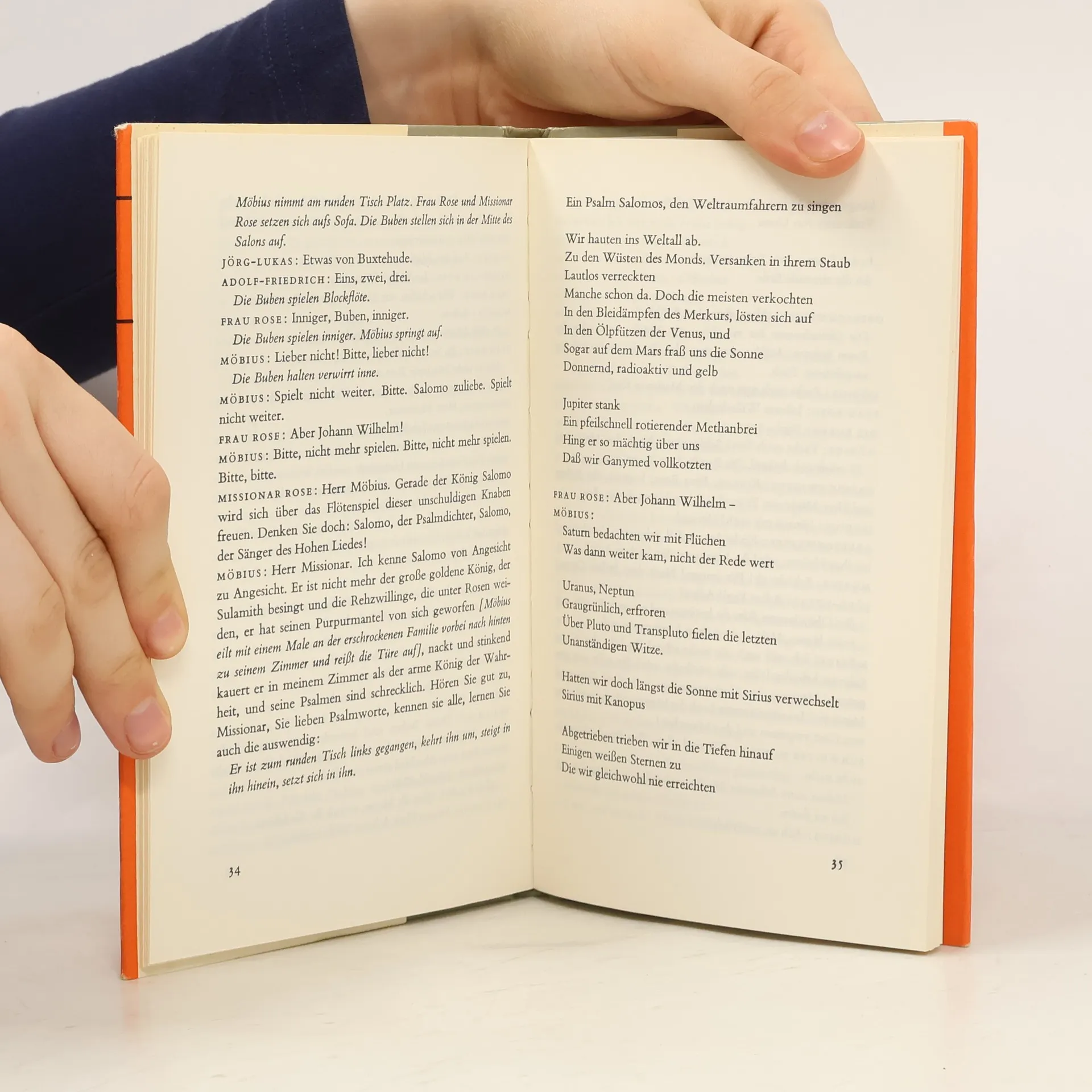 Dürrenmatt hat versucht, die paradoxe Situation darzustellen, in die das fortgeschrittenste Wissen, das der Kernphysik, geraten ist. Es gilt uns als Gipfel menschlicher Erkenntnis. Seine Formulierung hat auch die Hinrichtung der Welt möglich gemacht. Was machen die Entdecker, wenn sie Verantwortung für die Welt spüren? Gibt es Bewahrung der Welt vor dem Wissen? Bewahrung des Wissens vor dem Zugriff der Macht? Die Lösung der Frage führt- auf das Theater. Zum Versteckspiel, zur Maskerade. Dürrenmatts Kernphysiker Möbius, der Entdecker der furchtbaren Formel, flüchtet, seine Familie preisgebend, ins Irrenhaus. Er spielt Irrsinn, er fingiert die Heimsuchung durch den Geist Salomos, um das, was er entdeckte, als Produkt des Irrsinns zu diffamieren. Maskerade wird da zu einem moralischen Akt.