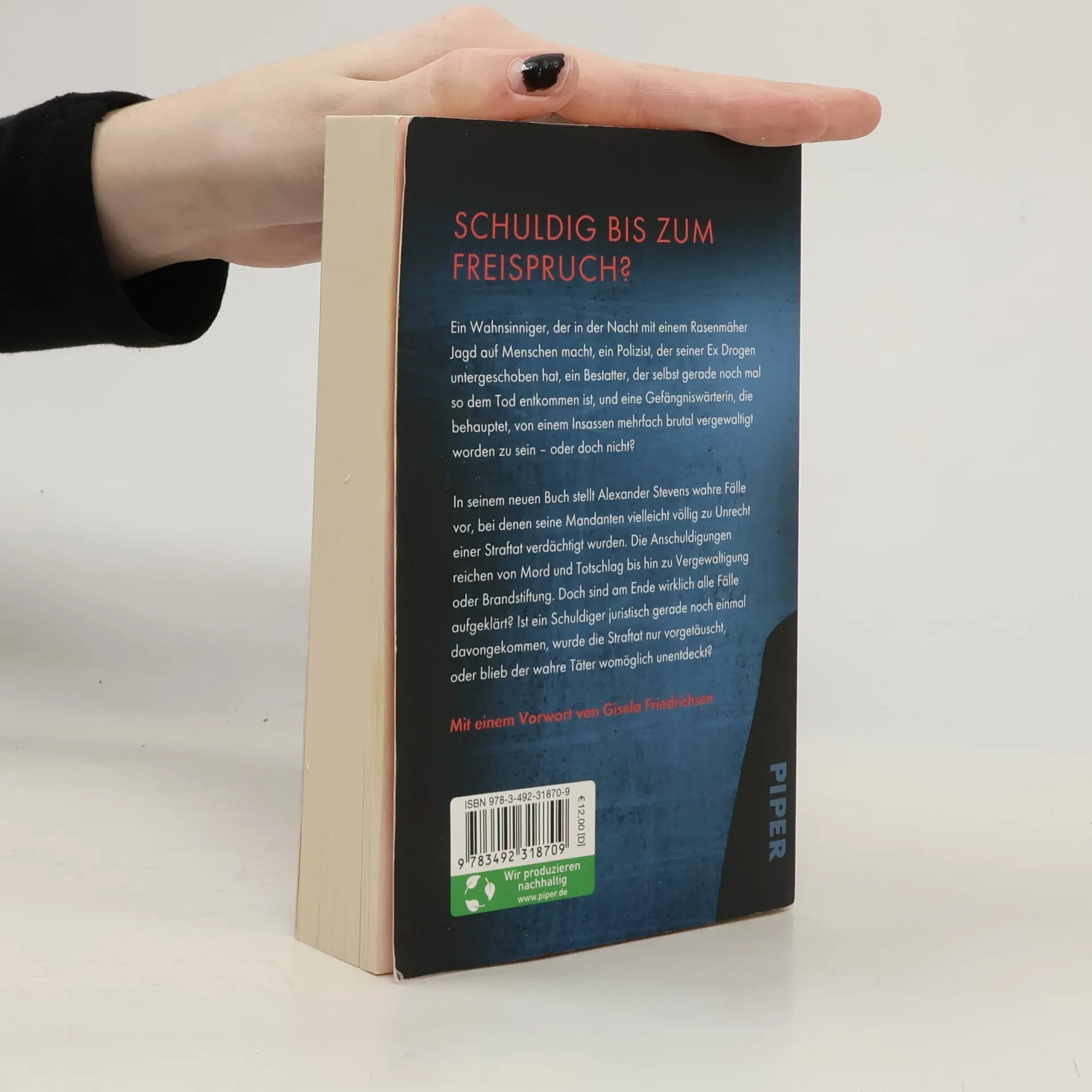 Schuldig bis zum Freispruch? Ein Wahnsinniger, der in der Nacht mit einem Rasenmäher Jagd auf Menschen macht, ein Polizist, der seiner Ex Drogen untergeschoben hat, ein Bestatter, der selbst gerade nochmal so dem Tod entkommen ist, und eine Gefängniswärterin, die behauptet, von einem Insassen mehrfach brutal vergewaltigt worden zu sein – oder doch nicht? In seinem neuen Buch stellt Alexander Stevens wahre Fälle vor, bei denen seine Mandanten vielleicht völlig zu Unrecht einer Straftat verdächtigt wurden. Die Anschuldigungen reichen von Mord und Totschlag bis hin zu Vergewaltigung oder Brandstiftung. Doch sind am Ende wirklich alle Fälle aufgeklärt? Ist ein Schuldiger juristisch gerade noch einmal davongekommen, wurde die Straftat nur vorgetäuscht, oder blieb der wahre Täter womöglich unentdeckt? Mit einem Vorwort von Gisela Friedrichsen