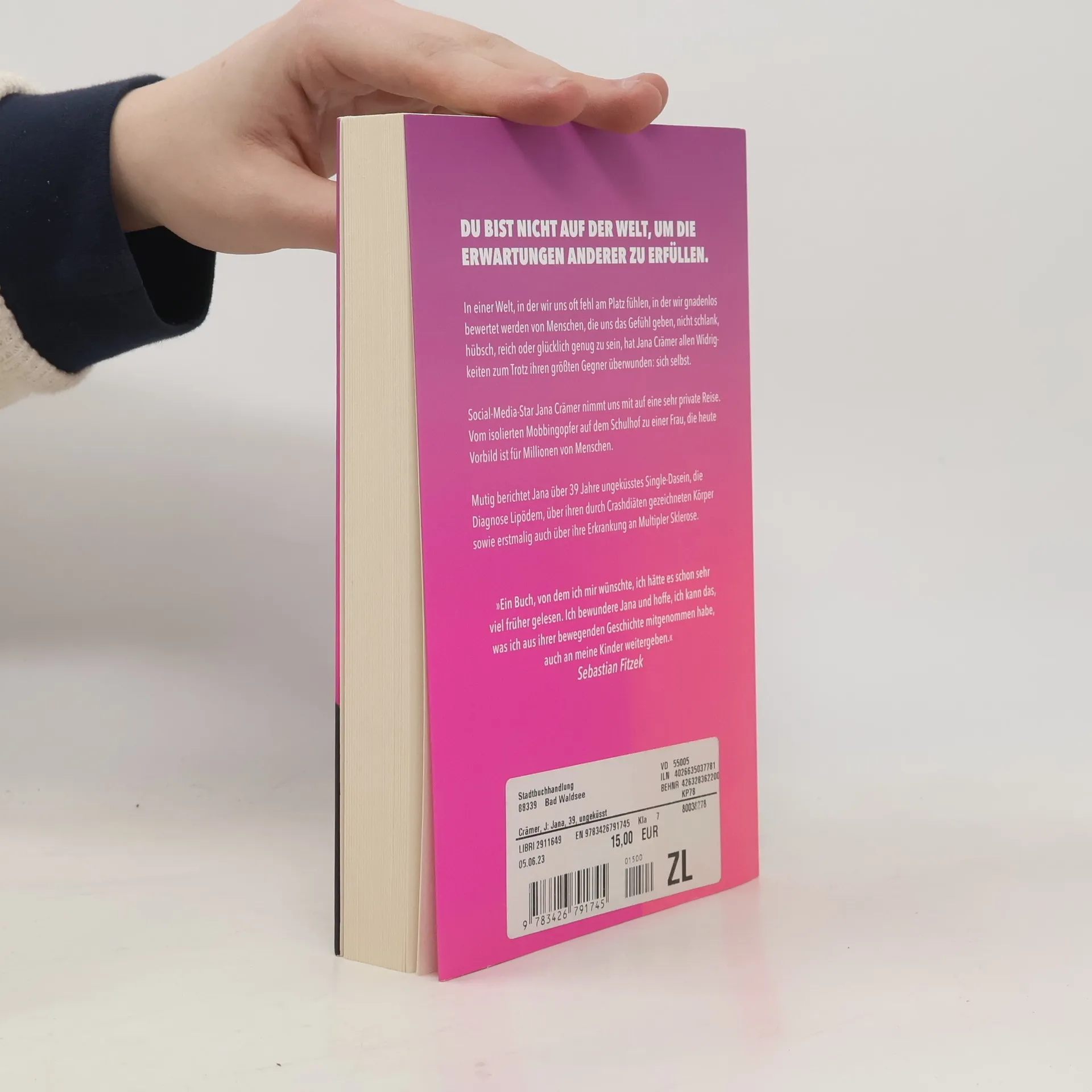 Ein Buch, von dem ich mir wünschte, ich hätte es schon viel früher gelesen. Ich bewundere Jana und hoffe, ich kann das, was ich aus ihrer bewegenden Geschichte mitgenommen habe, auch an meine Kinder weitergeben. Dies ist eine wahre Geschichte! Jana Crämer ist 39 Jahre alt, smart, sympathisch, humorvoll und beruflich erfolgreich. Doch sie hat noch nie einen Mann geküsst oder Händchen gehalten. Obwohl sich zu verlieben ihr großer Traum ist, ist sie in all den Jahren nicht zerbrochen. In einer Welt, in der wir oft das Gefühl haben, nicht genug zu sein, hat Jana ihren größten Gegner überwunden: sich selbst. »Jana, 39, ungeküsst« ist ein berührendes und mutmachendes Buch, das uns auf eine private Reise mitnimmt. Von einem isolierten Mobbing-Opfer, das unter Essstörungen, Bodyshaming und Selbsthass leidet, zu einer Frau, die heute Millionen in den sozialen Netzwerken inspiriert, wenn sie sagt: »Ich bin Jana, 39, ungeküsst und trotzdem glücklich. Wenn ich es geschafft habe, dann schaffst Du das auch.« Ein Buch für alle, die sich allein in einem vollen Raum fühlen, sich wegen ihrer Konfektionsgröße schämen oder aus anderen Gründen der Norm nicht entsprechen.