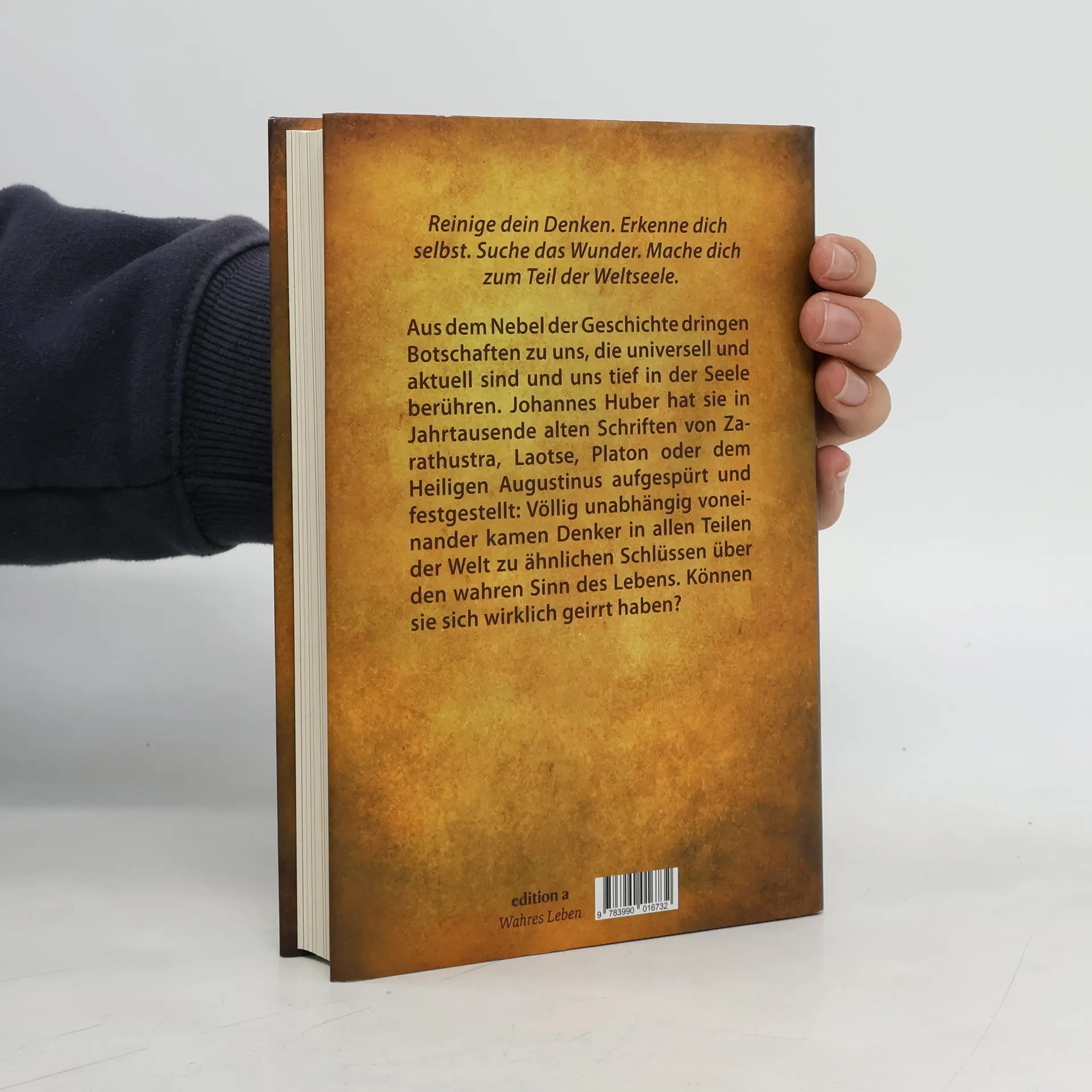 Reinige dein Denken. Erkenne dich selbst. Suche das Wunder. Mache dich zum Teil der Weltseele. Aus dem Nebel der Geschichte dringen Botschaften zu uns, die universell und aktuell sind und uns tief in der Seele berühren. Johannes Huber hat sie in Jahrtausende alten Schriften von Zarathustra, Laotse, Platon oder dem Heiligen Augustinus aufgespürt und festgestellt: Völlig unabhängig voneinander kamen Denker in allen Teilen der Welt zu ähnlichen Schlüssen über den wahren Sinn des Lebens. Können sie sich wirklich geirrt haben?