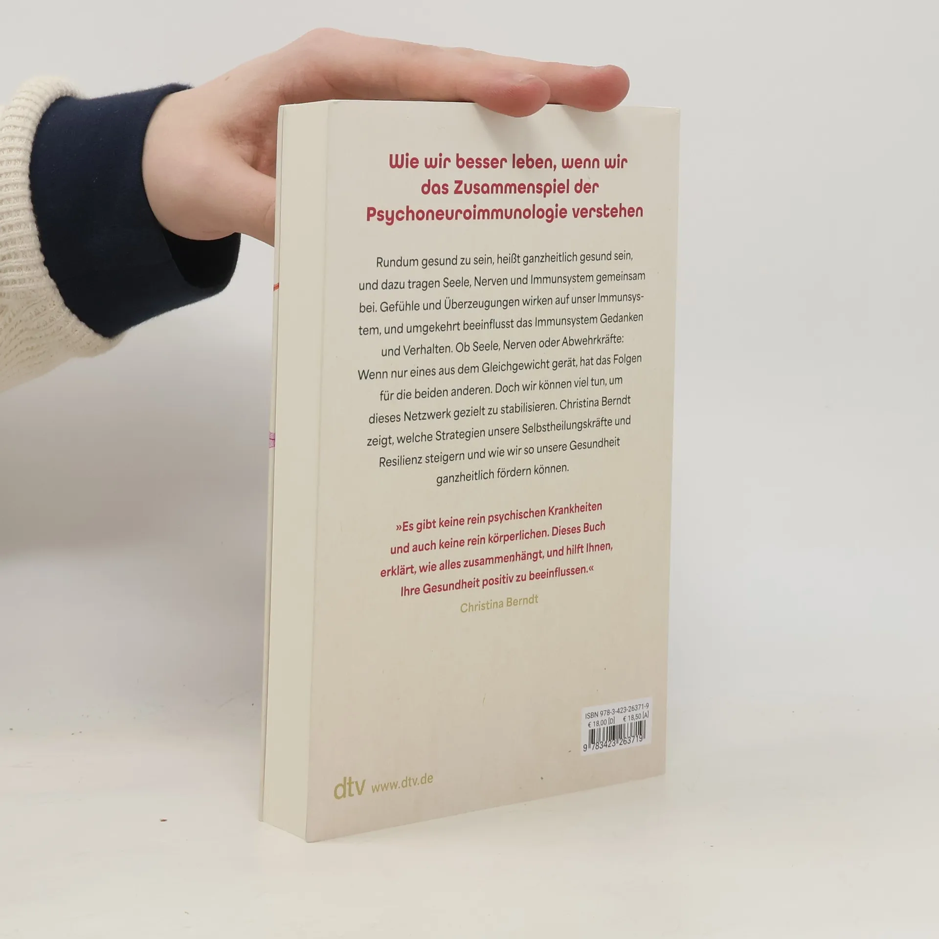 Wie wir besser leben, wenn wir das Zusammenspiel der Psychoneuroimmunologie verstehen Das neue Buch von Christina Berndt über die faszinierende Wissenschaft der Psychoneuroimmunologie Rundum gesund zu sein, heißt ganzheitlich gesund sein, und dazu tragen Seele, Nerven und Immunsystem gemeinsam bei. Gefühle und Überzeugungen wirken auf unser Immunsystem, und umgekehrt beeinflusst das Immunsystem Gedanken und Verhalten. Ob Seele, Nerven oder Abwehrkräfte: Wenn nur eines aus dem Gleichgewicht gerät, hat das Folgen für die beiden anderen. Doch wir können viel tun, um dieses Netzwerk gezielt zu stabilisieren. Christina Berndt zeigt, welche Strategien unsere Selbstheilungskräfte und Resilienz steigern und wie wir so unsere Gesundheit ganzheitlich fördern können. »Es gibt keine rein psychischen Krankheiten und auch keine rein körperlichen. Dieses Buch erklärt, wie alles zusammenhängt, und hilft Ihnen, Ihre Gesundheit positiv zu beeinflussen.« Christina Berndt Weitere Bücher der Autorin: Resilienz Zufriedenheit Individuation »Eine der renommiertesten Wissenschaftsjournalistinnen dieses Landes.« Markus Lanz