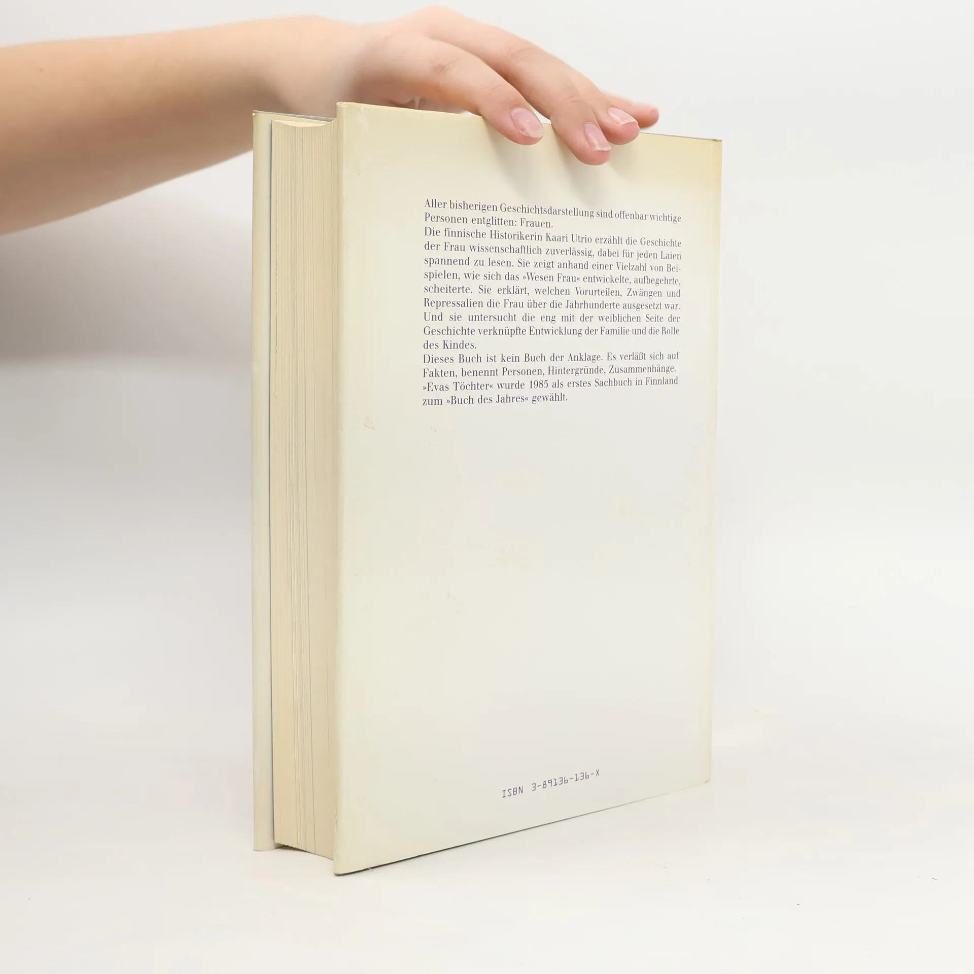 Aller bisherigen Geschichtsdarstellung sind offenbar wichtige Personen entglitten: Frauen. Die finnische Historikerin Kaari Utrio erzählt die Geschichte der Frau wissenschaftlich zuverlässig, dabei für jeden Laien spannend zu lesen. Sie zeigt anhand einer Vielzahl von Beispielen, wie sich das „Wesen Frau“ entwickelte, aufbegehrte, scheiterte. Sie erklärt, welchen Vorurteilen, Zwängen und Repressalien die Frau über die Jahrhunderte ausgesetzt war. Und sie untersucht die eng mit der weiblichen Seite der Geschichte verknüpfte Entwicklung der Familie und die Rolle des Kindes. Dieses Buch ist kein Buch der Anklage. Es verläßt sich auf Fakten, benennt Personen, Hintergründe, Zusammenhänge.