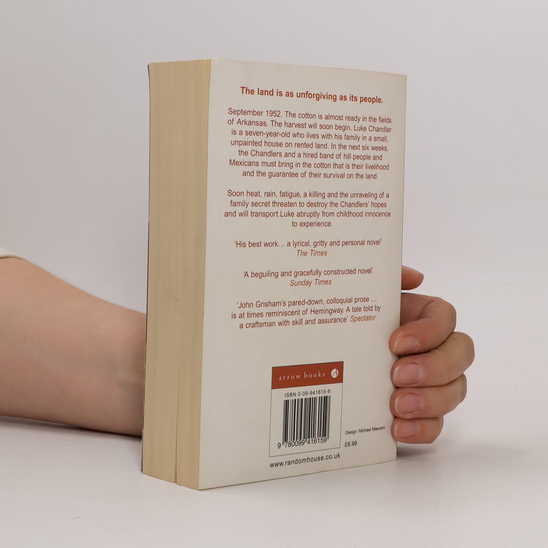 The hill people and the Mexicans arrived on the same day. It was a Wednesday, early in September 1952. The Cardinals were five games behind the Dodgers with two weeks to go, and the season looked hopeless. The cotton, however, was waist high to my father, almost over my head, and he and my grandfather could be heard before supper whispering words that were seldom heard. It could be a "good crop." Thus begins the new novel from John Grisham, a story inspired by his own childhood in rural Arkansas. The narrator is a seven year old farm boy named Luke Chandler, who lives in the cotton fields with his parents and grandparents in a little house that's never been painted. The Chandlers farm eighty acres that they rent, not own, and when the cotton is ready they hire a truckload of Mexicans and a family from the Ozarks to help harvest it. For six weeks they pick cotton, battling the heat, the rain, the fatigue, and sometimes, each other. As the weeks pass Luke sees and hears things no seven year old could possibly be prepared for, and finds himself keeping secrets that not only threaten the crop but will change the lives of the Chandlers forever. A Painted House is a moving story of one boy's journey from innocence to experience.