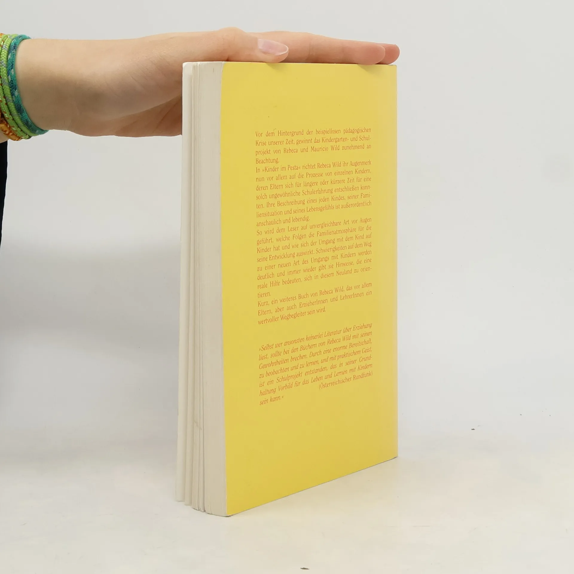 Das neueste Buch von Rebeca Wild, in dem sie ihr Augenmerk vor allem auf die Prozesse von einzelnen Kindern richtet. Die Lektüre dieses Buches regt dazu an, unser derzeitiges Schulsystem zu überdenken und macht Mut, neue Wege zu erproben. ÖsterreichischerErfahrungen Kinderschutzbund Die Bücher von Rebeca Wild über den Pesta gehören mit zum Lebendigsten und Spannendsten, was in den letzten Jahrzehnten über Pädagogik und Schule geschrieben wurde. Enfin (Schweiz) Rebeca Wilds Beschreibung eines jeden Kindes, seiner Familiensituation und seines Lebensgefühls ist sehr anschaulich und lebendig. So führt uns Rebeca Wild auf unvergleichbare Art vor Augen, welche Folgen die Familienatmosphäre für die Kinder hat und wie sich der Umgang mit dem Kind auf seine Entwicklung auswirkt. Schwierigkeiten auf dem Weg zu einer neuen Art des Umgangs mit Kindern werden deutlich und immer wieder gibt sie Hinweise, die eine reale Hilfe bedeuten, sich in diesem Neuland zu orientieren. Ein lebendiges und eindrückliches Buch.