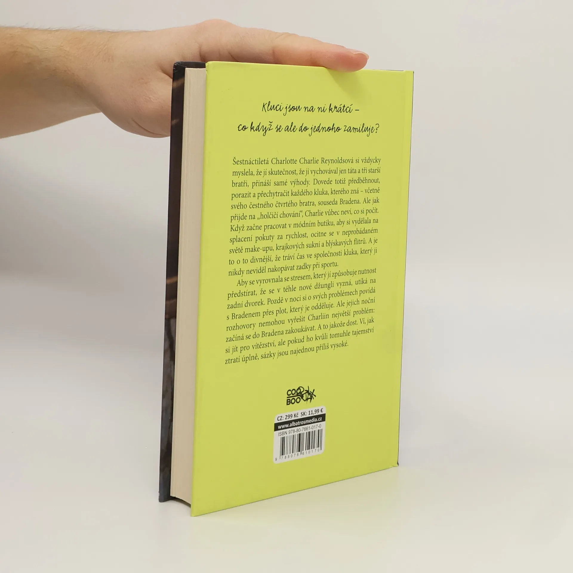 Šestnáctiletá Charlotte Charlie Reynoldsová si vždycky myslela, že jí skutečnost, že ji vychovával jen táta a tři starší bratři, přináší samé výhody. Dovede totiž předběhnout, porazit a přechytračit každého kluka, kterého zná - včetně svého čtvrtého bratra, souseda Bradena. Ale jak přijde na ,,holčičí chování", Charlie vůbec neví, co si počít. Když začne pracovat v módním butiku, aby si vydělala na splacení pokuty za rychlost, ocitne se v neprobádaném světě make-upu, krajkových sukní a blýskávých flitrů. A je to o to divnější, že tráví čas ve společnostu kluka, který ji nikdy neviděl nakopávat zadky při sportu. Aby se vyrovnala se stresem, který ji způsobuje nutnost předstírat, že se v téhle nové džungli vyzná, utíká na zadní dvorek. Pozdě v noci si o svých problémech povídá s Bradenem přes plot, který je odděluje. Ale jejich noční rozhovory nemohou vyřešit Charliin největší problém: začíná se do Bradena zakoukávat. A to jakože dost. Ví, jak si jít pro vítězství, ale pokud ho kvůli tomuhle tajemství ztratí úplně, sázky jsou najednou příliš vysoké.