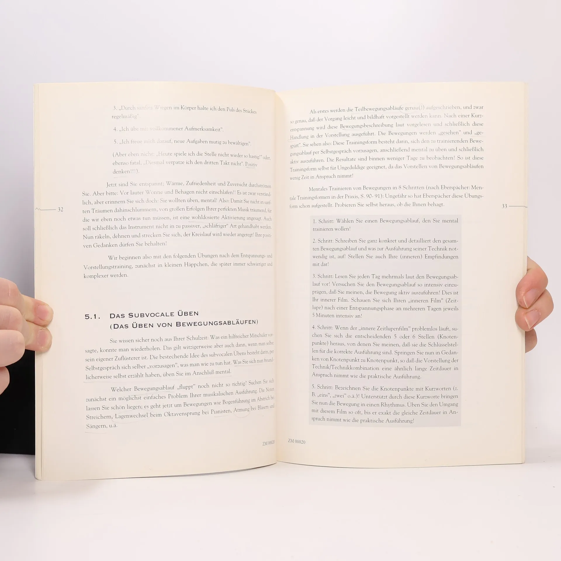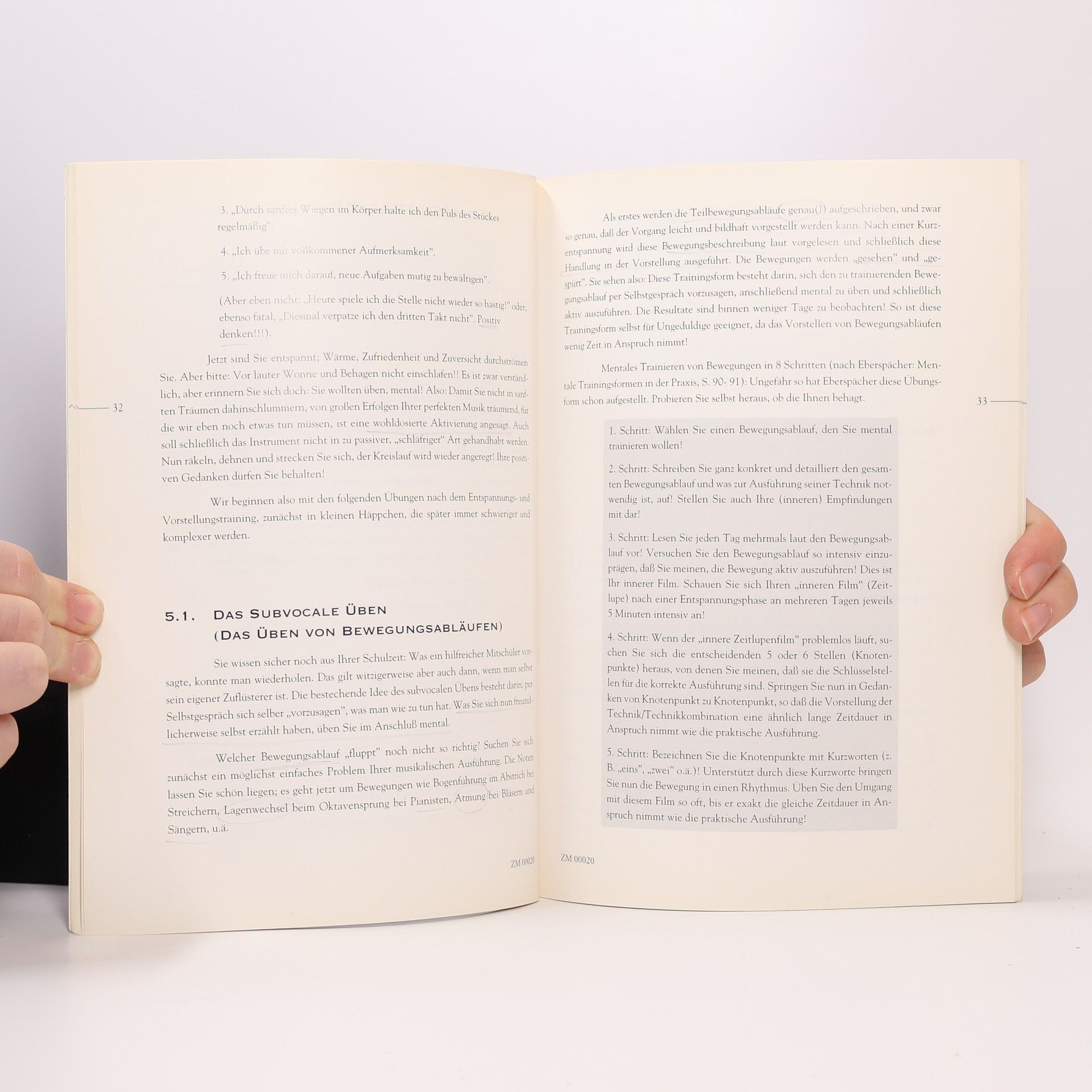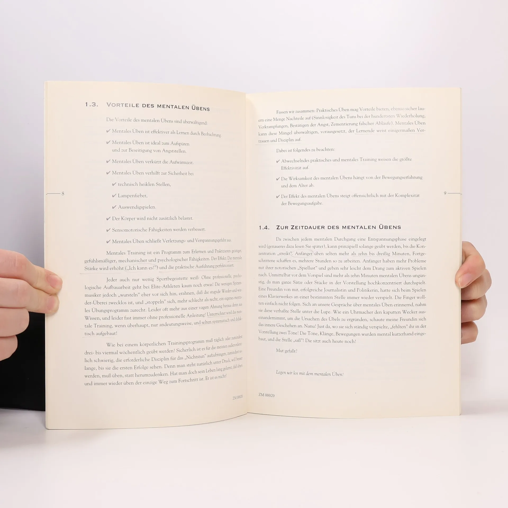 In ihrem Buch beschreibt die Autorin systematische Techniken zur Entspannung und gibt zahlreiche Anregungen zur Gestaltung und zum zeitlichen Ablauf des Übens. Mentales Training kann nicht das Üben mit dem Instrument ersetzen, kann aber „un-sinniges“ Abspulen und den Aufbau von Angststellen verhindern helfen. Das Buch räumt mit überholten Vorstellungen von der Übearbeit auf und versucht, sie durch effektivere zu ersetzen. Ein umfangreiches Literaturverzeichnis gibt Anregungen zur Weiterarbeit und Vertiefung in einzelnen Bereichen.