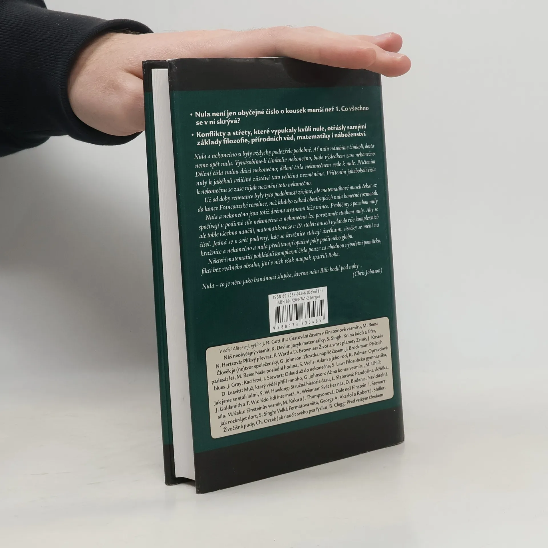 Životopis jedné nebezpečné myšlenky. Tato kniha je historií nuly. Zrodila se ve starověku a posléze se jí podařilo vybojovat si místo na slunci na Východě, s prosazením na Západě to však měla mnohem obtížnější. Možná proto se naší civilizaci dodnes mstí a neustále působí nové a nové potíže – od havárií řídících systémů až po fundamentální problémy v moderní fyzice. Stejně je však naše kniha i historií lidí, kteří po staletí s nulou bojovali a nakonec jí v nerovném boji podlehli učenců a mystiků, vědců a kněží, všech těch, kdo se nule snažili porozumět a ovládnout ji. Je to příběh marných, někdy i násilných pokusů západního světa ochránit se před vlivem východních myšlenek. A je to také historie paradoxů, které s sebou přináší nevinně vypadající číslo, paradoxů, které mátly i nejchytřejší mozky minulého století a hrozily narušit vlastní základy vědeckého myšlení. Nula nakonec vždy zvítězila nad těmi, kdo se jí stavěli na odpor. Lidé ji nikdy nedokázali přinutit, aby se přizpůsobila jejich filozofiím, to ona utvářela naše názory na vesmír i na samotného Boha.