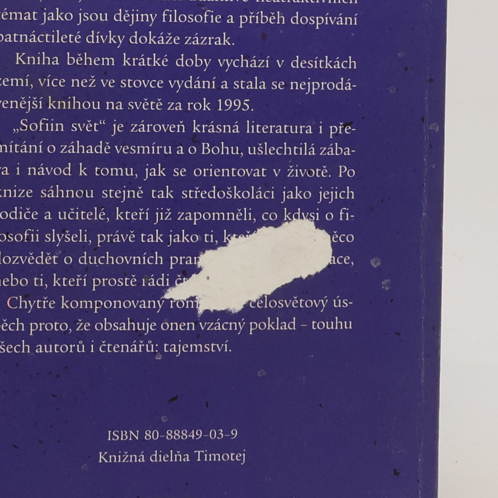 Autor, norský učitel Jostein Gaarder, kombinací zdánlivě neatraktivních témat jako jsou dějiny filosofie a příběh dospívání patnáctileté dívky dokázal zázrak. Kniha během krátké doby vyšla v desítkách zemí, více než ve stovce vydání a stala se nejprodávanější knihou na světě za rok 1995. "Sofiin svět" je zároveň krásná literatura i přemítání o záhadě vesmíru a o Bohu, ušlechtilá zábava i návod k tomu, jak se orientovat v životě.