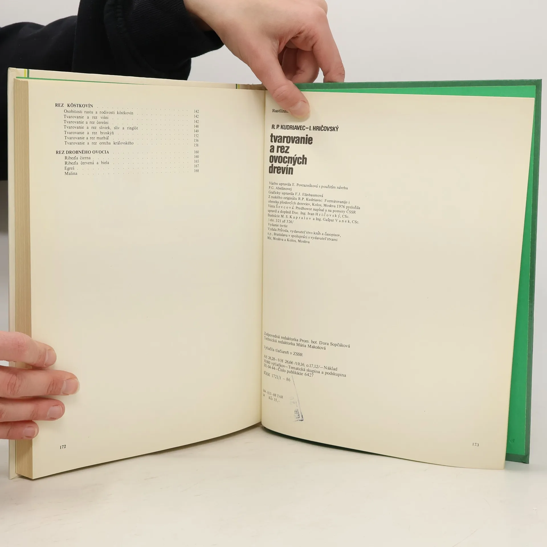 Kapitoly: Základy tvarovania a rezu ovocných stromov, Spôsoby a technika rezu, Tvary korún, Rez ovocných stromov a ošetrovanie korún, Prevrúbľovanie ovocných stromov, Rez kôstkovín, Rez drobného ovocia. Cena knihy v čase vydania: 55 Kčs.