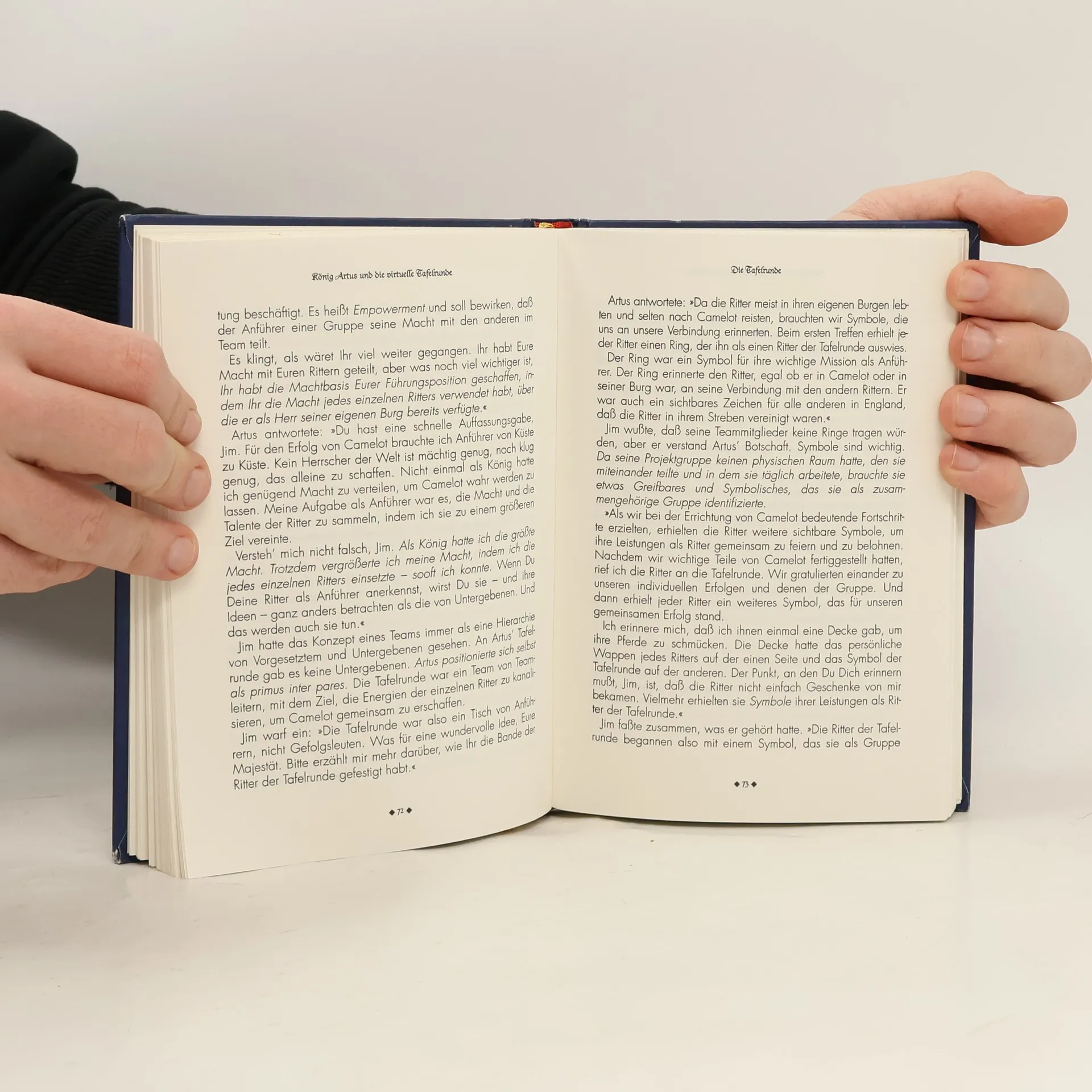 Kurzinhalt: Anhand der Erlebnisse und Erfahrungen aus der Tafelrunde lehrt König Artus dem Leiter eines Teleteams die Geheimnisse der effizienten und erfolgreichen Führung eines solchen Teams. Diese Anleitung für Teammanagement hilft die drei größten Feinde (Distanz, Isolation und Vergangenheit) zu erkennen und zu überwinden, die eigene Rolle durch das Ausnützen der Stärken der Mitarbeiter zu festigen, eine Vertauensbasis zu schaffen, auch über Entfernungen hinweg die Ressourcen auszuschöpfen und die modernen Technologien einzusetzen um geographische und emotionale Distanzen zu überbrücken