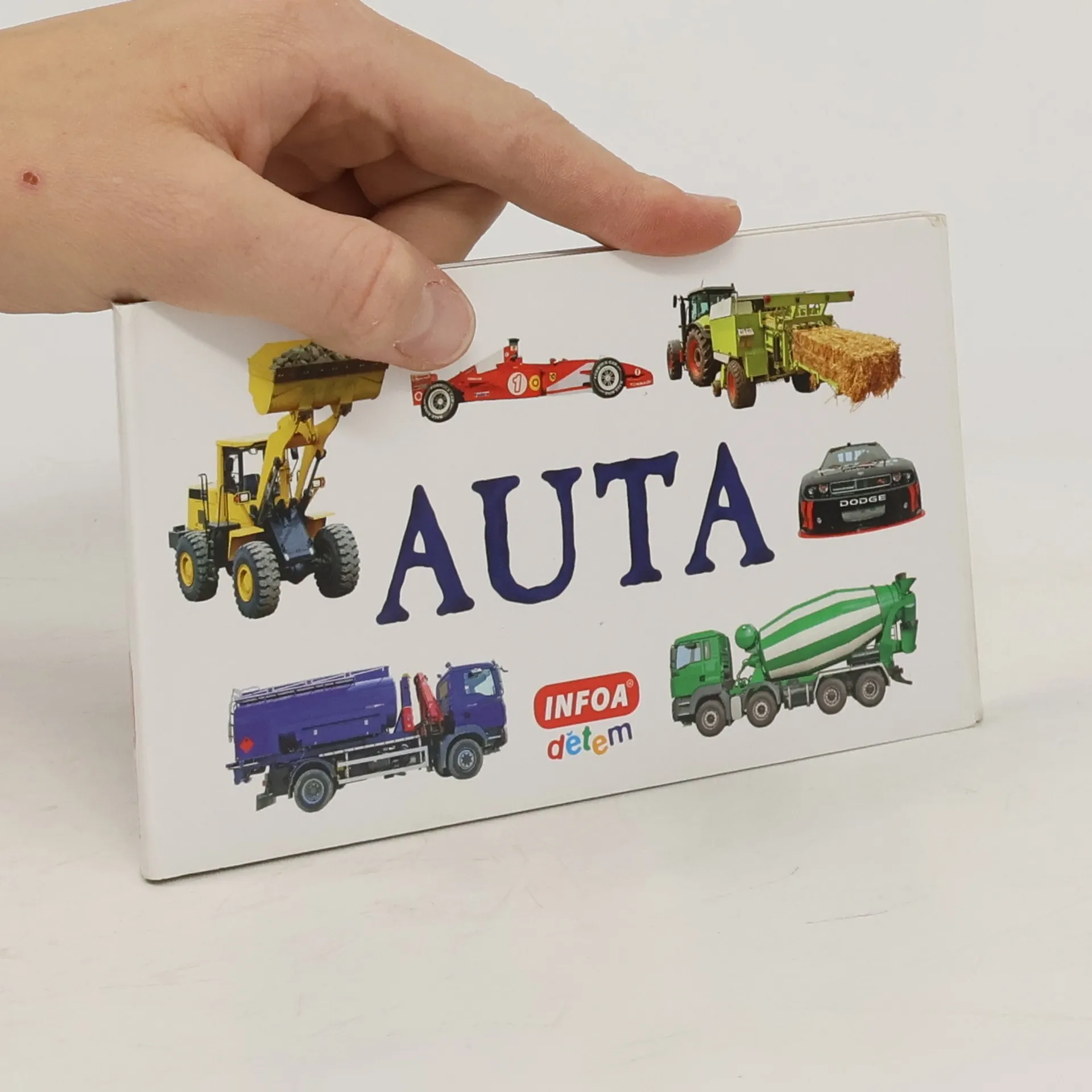 Leporelo s obrázky aut - historická auta, osobní auta, zemědělské stroje, silná závodní auta, silná přepravní auta, nákladní auta se sklápěčkou, speciální auta, hasičská auta, nakladače a zvedáky, bagry a stavební stroje, transportéry.
