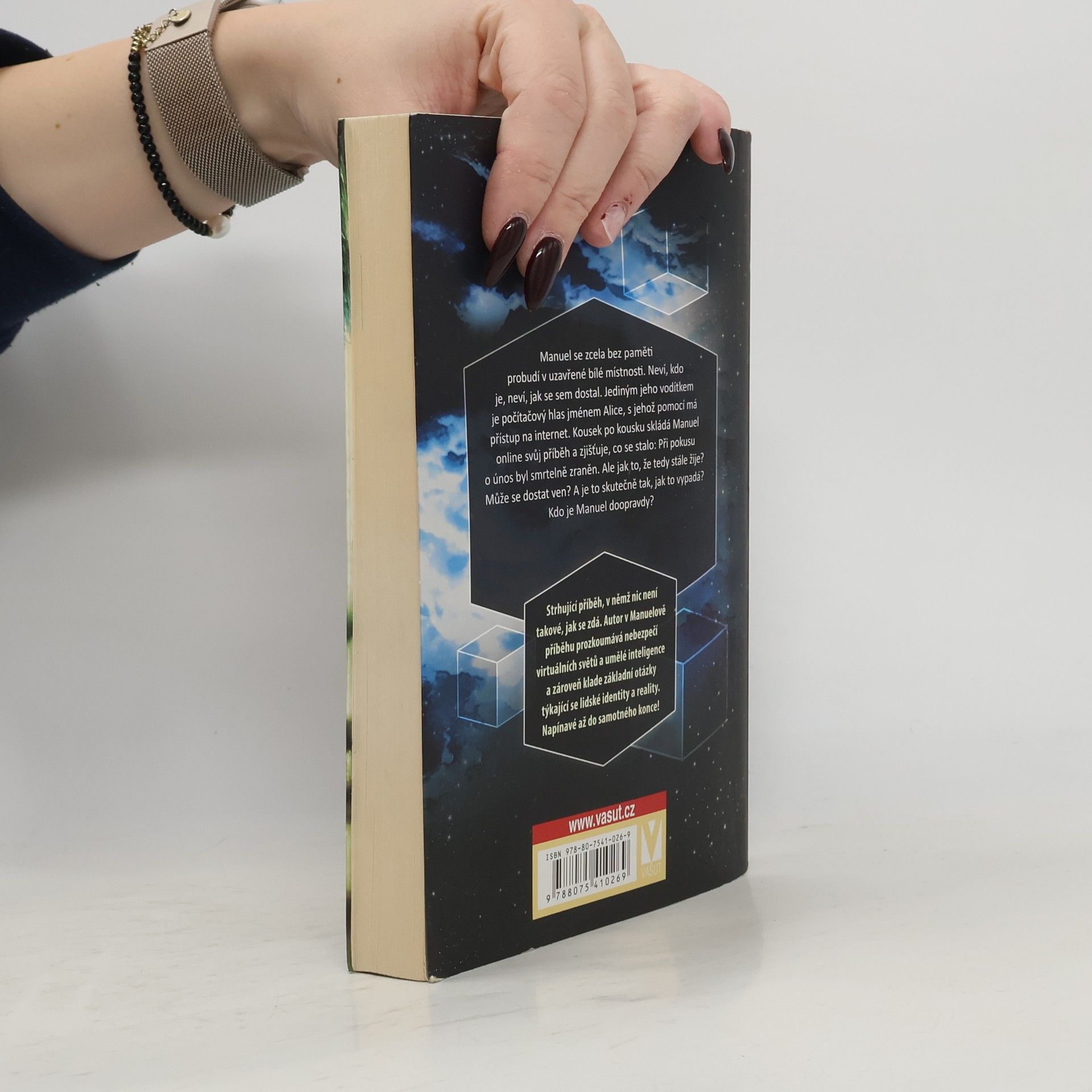 Manuel se zcela bez paměti probudí v uzavřené bílé místnosti. Neví, kdo je, neví, jak se sem dostal. Jediným jeho vodítkem je počítačový hlas jménem Alice, s jehož pomocí má přístup na internet. Kousek po kousku skládá Manuel online svůj příběh a zjišťuje, co se stalo: Při pokusu o únos byl smrtelně zraněn. Ale jak to, že tedy stále žije? Může se dostat ven? A je to skutečně tak, jak to vypadá? Kdo je Manuel doopravdy? Strhující příběh, v němž nic není takové, jak se zdá. Autor v Manuelově příběhu prozkoumává nebezpečí virtuálních světů a umělé inteligence a zároveň klade základní otázky týkající se lidské identity a reality. Napínavé až do samotného konce!