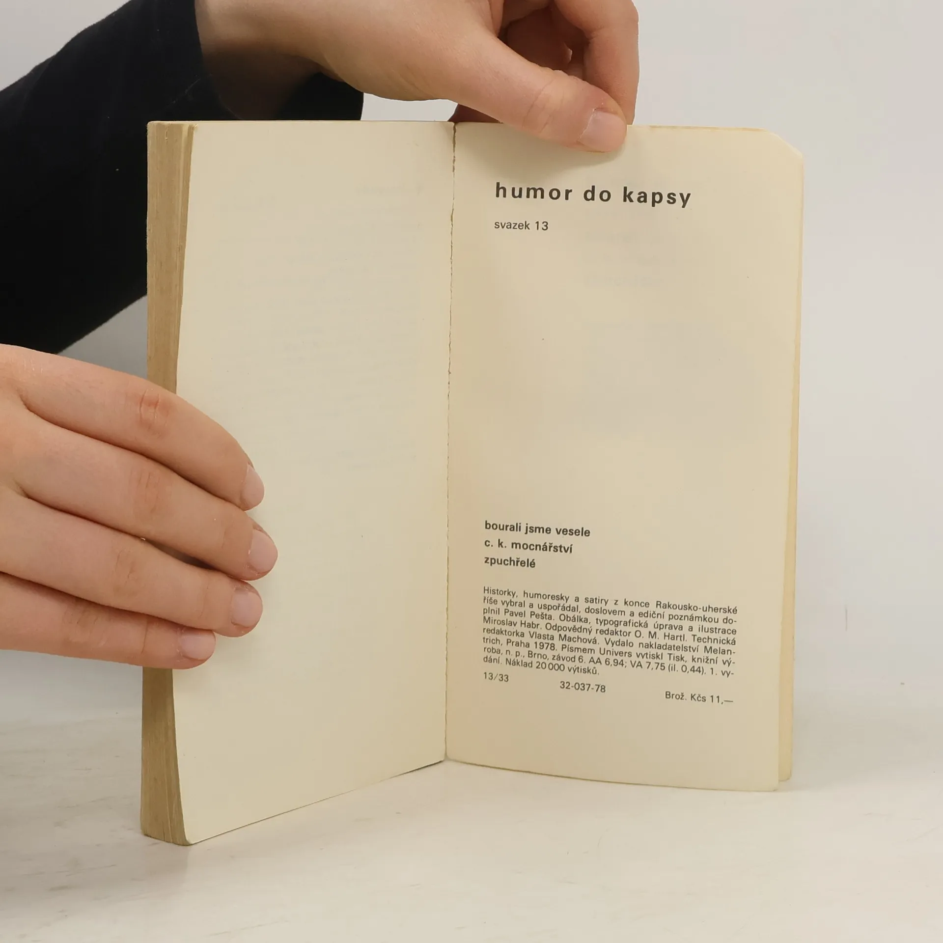 Historky, humoresky a satiry z konce Rakousko-uherské říše. Satirické epizody, črty, povídky, anekdoty a epigramy jsou vybrány z humoristických a zábavných časopisů z let 1906-1919 a z díla V. Dyka, J. Mahena, K. Čapka, I. Olbrachta, K. Poláčka, E. Basse, J. Johna a zejména J. Haška.