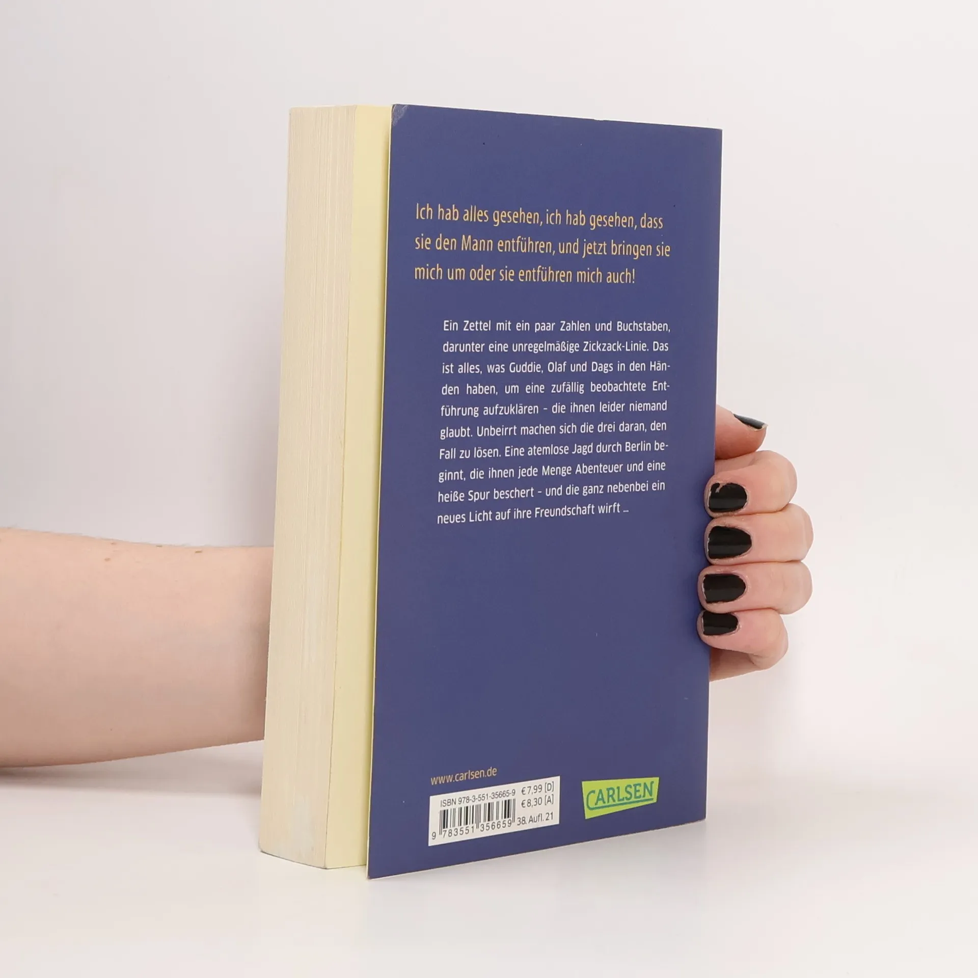 Ein Zettel mit ein paar Zahlen und Buchstaben, darunter eine unregelmäßige Zickzack-Linie. Das ist alles, was Guddie, Olaf und Dags in den Händen haben, um eine zufällig beobachtete Entführung aufzuklären – die ihnen leider niemand glaubt. Unbeirrt machen sich die drei daran, den Fall zu lösen. Eine atemlose Jagd durch Berlin beginnt, die ihnen jede Menge Abenteuer und eine heiße Spur beschert – und die ganz nebenbei ein neues Licht auf ihre Freundschaft wirft …