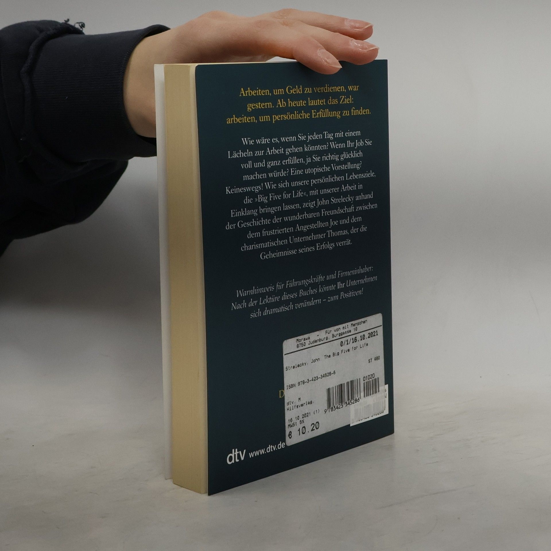 Arbeiten, um Geld zu verdienen, war gestern Durch Zufall lernt Joe, ein mit seinem Job unzufriedener Angestellter, den charismatischen Geschäftsmann Thomas kennen. Rasch entwickelt sich eine tiefe Freundschaft zwischen den beiden Männern. Thomas wird zu Joes Mentor und offenbart ihm die Geheimnisse seines Erfolgs. Er zeigt Joe, wie wichtig es ist, auch in der Arbeit erfüllt zu sein. Seine Unternehmen führt Thomas anhand zweier Leitlinien: Jeder Mitarbeiter muss seine Bestimmung sowie seine »Big Five for Life« kennen, also wissen, welche fünf Ziele er im Leben erreichen will. Diese Ideen helfen Joe, seine Wünsche zu verwirklichen. Doch Thomas will möglichst viele an seinem Wissen teilhaben lassen: Seine gesammelten Aufzeichnungen liegen hier vor Ihnen. Arbeiten, um Geld zu verdienen, war gestern. Ab heute lautet das Ziel: arbeiten, um persönliche Erfüllung zu finden.