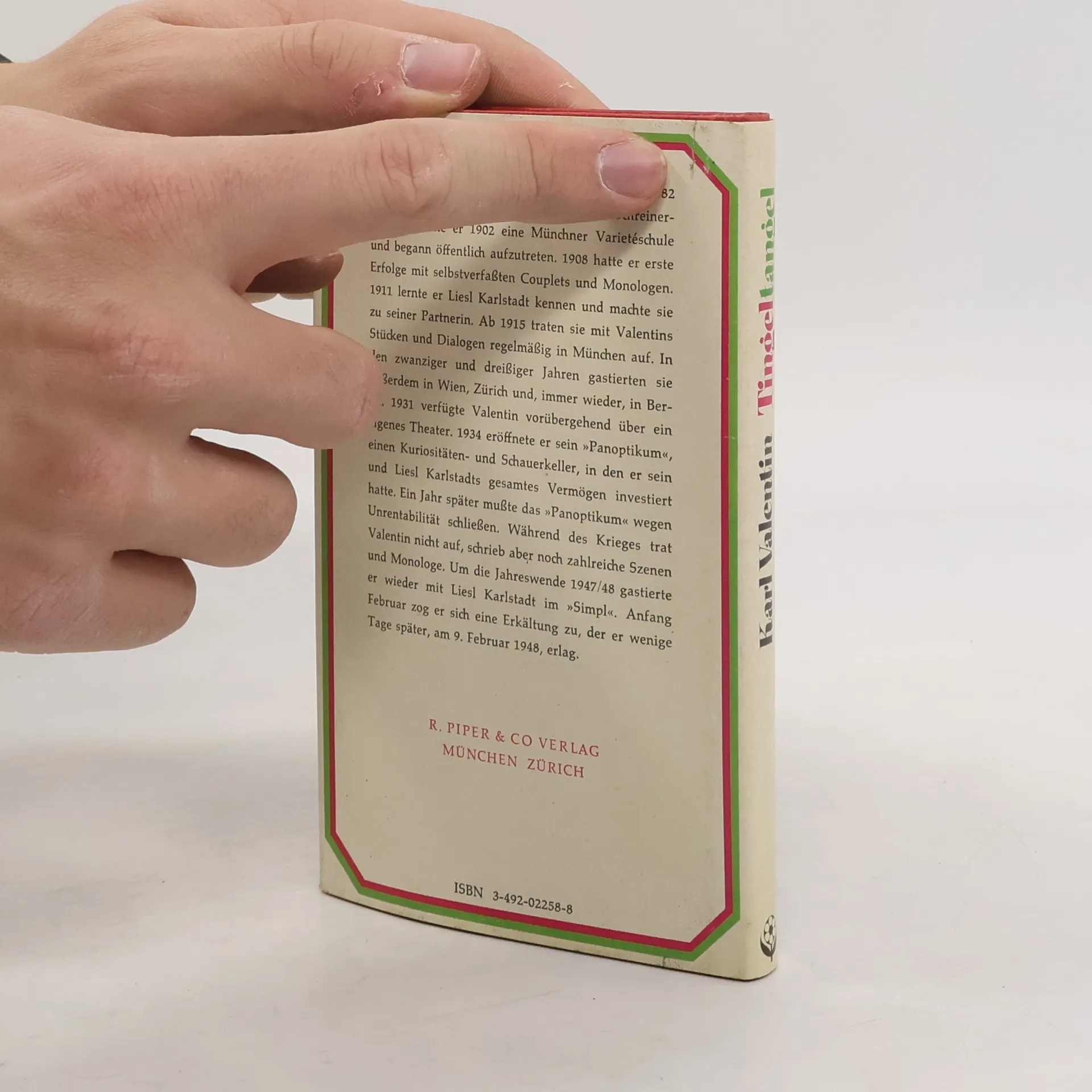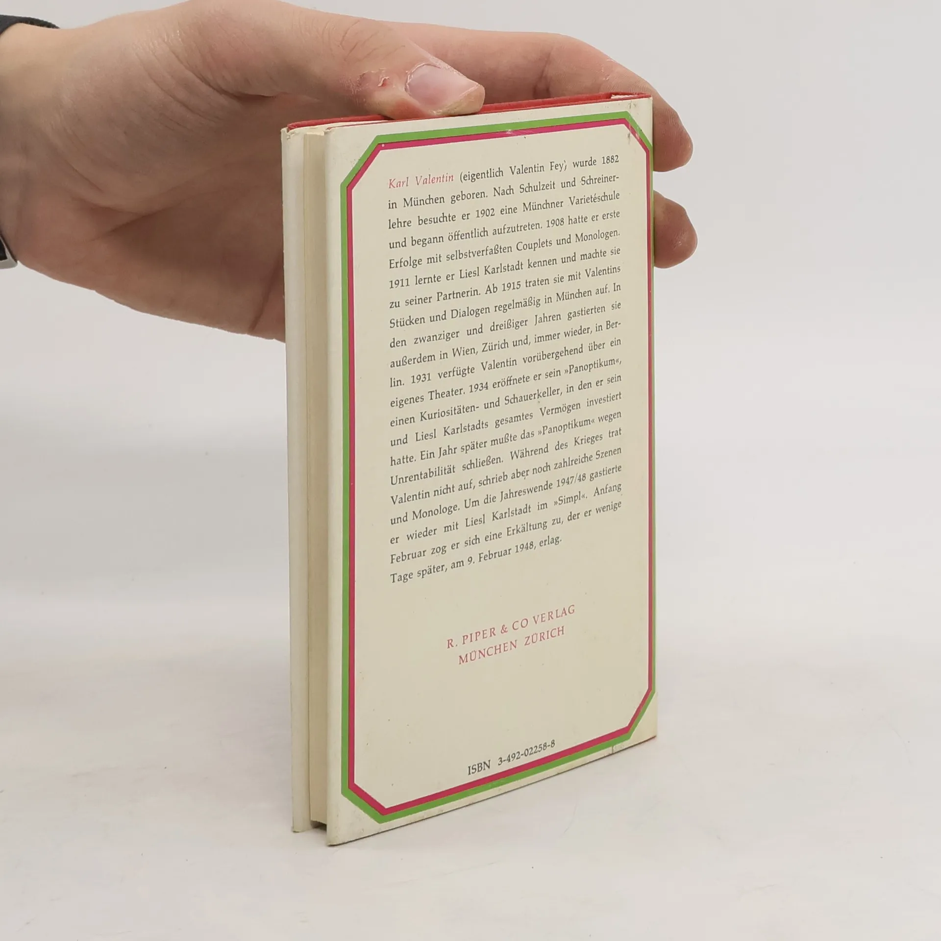 Karl Valentin (eigentlich Valentin Fey) wurde 1882 in München geboren. Nach Schulzeit und Schreinerlehre besuchte er 1902 eine Münchner Varietéschule und begann öffentlich aufzutreten. 1908 hatte er erste Erfolge mit selbstverfassten Couplets und Monologen. 1911 lernte er Liesl Karlstadt kennen und machte sie zu seiner Partnerin. Ab 1915 traten sie mit Valentins Stücken und Dialogen regelmäßig in München auf. In den zwanziger und dreißiger Jahren gastierten sie außerde in Wien, Zürich und, immer wieder, in Berlin. 1931 verfügte Valentin vorübergehend über ein eigenes Theater. 1934 eröffnete er sein "Panoptikum", einen Kuriositäten- und Schauerkeller, in den er sein und Liesl Karlstadts gesamtes Vermögen investiert hatte. Ein Jahr später musste das "Panoptikum" wegen Unrentabilität schließen. Während des Krieges trat Valentin nicht auf, schrieb aber noch zahlreiche Szenen und Monologe. Um die Jahreswende 1947/48 gastierte er wieder mit Liesl Karlstadt im "Simpl". Anfang Februar zog er sich eine Erkältung zu, der er wenige Tage später am 9. Februar 1948, erlag.