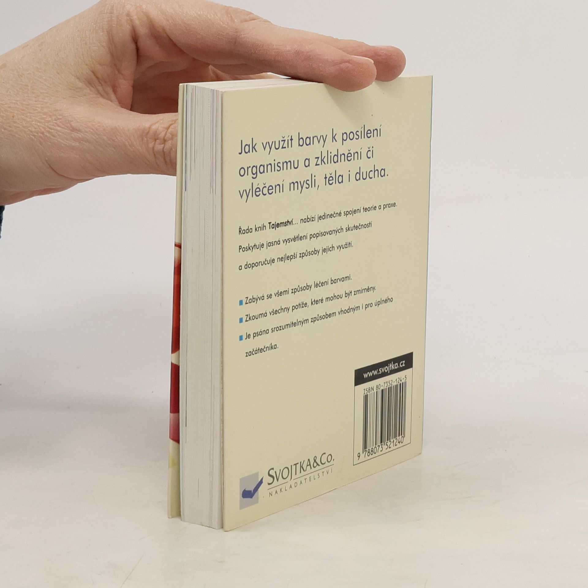 1514 Léčení barvami V této knize se dozvíme, jak využít barvy k posílení organismu a zklidnění či vyléčení mysli, těla i ducha. Nabízí jedinečné spojení teorie a praxe. Poskytuje jasná vysvětlení popisovaných skutečností a doporučuje nejlepší způsoby jejich využití. Zabývá se všemi způsoby léčení barvami. Zkoumá všechny potíže, které mohou být zmírněny. Je psána srozumitelným způsobem vhodným i pro úplného začátečníka.