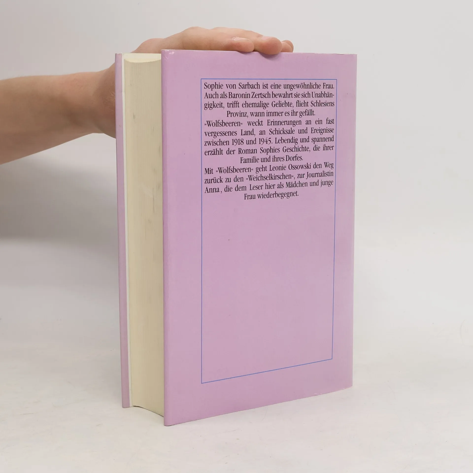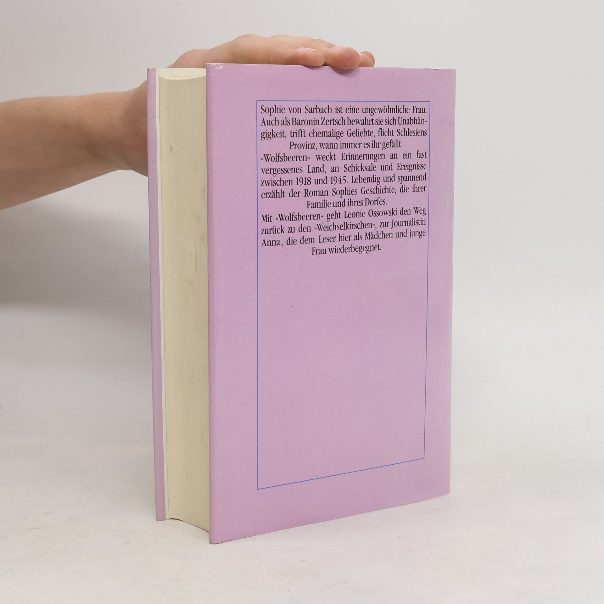 Sophie von Sarbach ist eine ungewöhnliche Frau. Auch als Baronin Zertsch bewahrt sie sich Unabhängigkeit, trifft ehemalige Geliebte, flieht Schlesiens Provinz, wann immer ihr es gefällt. "Wolfsbeeren" weckt Erinnerungen an ein fast vergessenes Land, an Schicksale und Ereignisse zwischen 1918 und 1945. Lebendig und spannend erzählt der Roman Sophies Geschichte, die ihrer Familie und ihres Dorfes. Mit "Wolfsbeeren" geht L. Ossowski den Weg zurück zu den "weichselkirschen", zur Journalistin Anna, die dem Leser hier als Mädchen und junge Frau wiederbegegnet