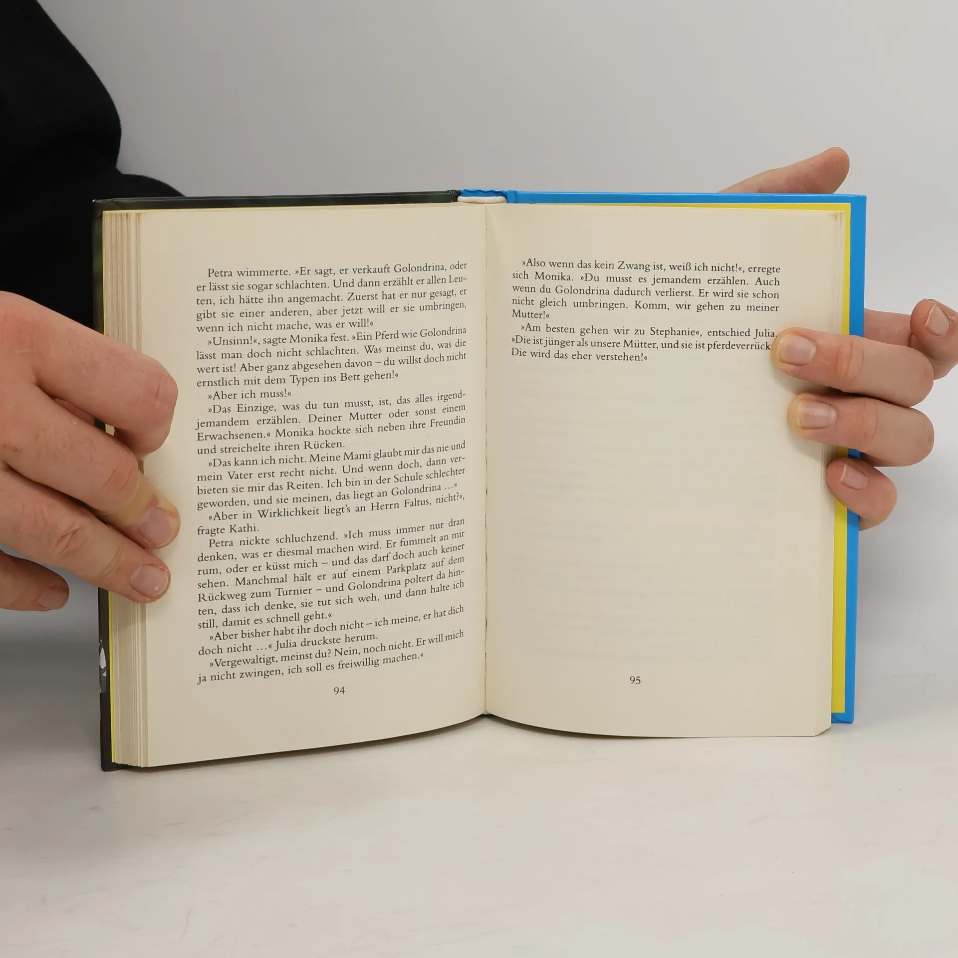 Julias Freundin Petra aus dem Reitstall ist anfangs begeistert, als sie das neue Dressurpferd "Golondrina" reiten darf. Doch dann bemerken die junge Protagonistin der Buchserie und ihre Freundinnen, dass sich das Mädchen immer mehr zurückzieht. Hat ihr Verhalten etwas mit dem Besitzer der Stute zu tun? Im zehnten Band der beliebten Kinder- und Jugendbuchreihe greift die Autorin Christiane Gohl einfühlsam die schwierigen Themen sexuelle Nötigung und Missbrauch auf. -
