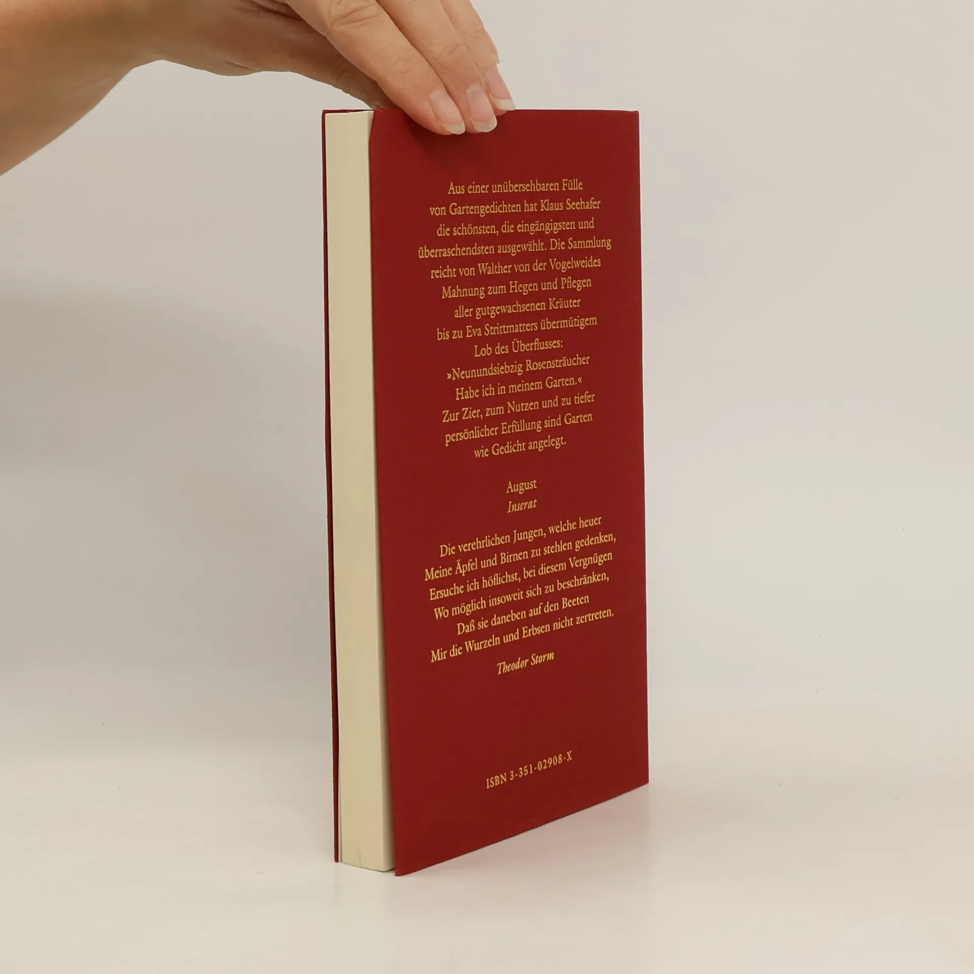 Für Laube und Liegestuhl Von Eichendorff bis Benn, von Annette von Droste-Hülshoff bis Eva Strittmatter: Garten- und Parkgedichte finden sich in der deutschsprachigen Literatur von ihren Anfängen bis zur Gegenwart. Klaus Seehafer, Herausgeber und Autor (u. a. Mein Leben ein einzig Abenteuer. Johann Wolfgang Goethe. Biografie, Aufbau-Verlag 1998), hat aus einer unübersehbaren Fülle das Schönste und Vertrauteste ausgewählt. In Goethes „Herbstgefühl“ und Mörikes „Sieh, der Kastanie kindliches Laub“ steht der Garten als Thema im Vordergrund. Bei Storm und C. F. Meyer, Trakl und Rilke ist er die Folie für Ereignisse, Erinnerungen und Glücksmomente. Großstadtbewohner wie Max Herrmann-Neiße, Paul Zech, Brecht und Kunert hingegen haben über Garten und Parks anrührende Gedichte geschrieben. Autoren, die vom Schicksal zu äußerer und innerer Unruhe verurteilt waren, schufen beziehungsreiche Kunstwerke, in denen sich Natur und Umwelt als Spiegel und Ruhepol ihrer Erfahrungen finden. Weitere Autoren: Anna Louisa Karsch, Heine, Wedekind, George, Hofmannsthal, Hesse, Loerke, Georg Maurer, Peter Huchel, Ingeborg Bachmann, Karl Krolow, Peter Hacks, Sarah Kirsch, Eva Strittmatter.