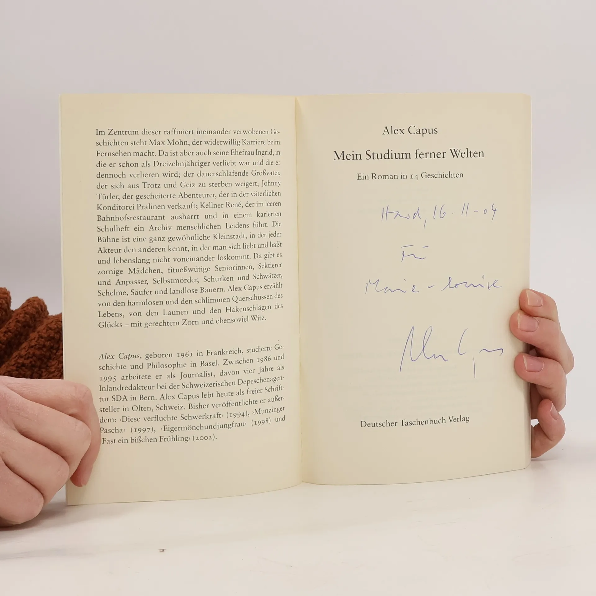 Comédie humaine unserer Zeit Im Zentrum dieser raffiniert ineinander verwobenen Geschichten steht Max Mohn, der widerwillig Karriere beim Fernsehen macht. Da ist aber auch seine Ehefrau Ingrid, in die er schon als Dreizehnjähriger verliebt war und die er dennoch verlieren wird; der dauerschlafende Großvater, der sich aus Trotz und Geiz zu sterben weigert; Johnny Türler, der gescheiterte Abenteurer, der in der väterlichen Konditorei Pralinen verkauft; Kellner René, der im leeren Bahnhofsrestaurant ausharrt und in einem karierten Schulheft ein Archiv menschlichen Leidens führt. Die Bühne ist eine ganz gewöhnliche Kleinstadt, in der jeder Akteur den anderen kennt, in der man sich liebt und hasst und lebenslang nicht voneinander loskommt. Alex Capus erzählt von den harmlosen und den schlimmen Querschüssen des Lebens, von den Launen und den Hakenschlägen des Glücks – mit gerechtem Zorn und ebensoviel Witz. Eine präzis gezeichnete Comédie humaine unserer Zeit. »Wir wollen sofort nach Olten ziehen …Wie macht Alex Capus das? Indem er uns zeigt, welche Fülle an Geschichten überall um uns herum zu entdecken ist, wenn man nur richtig gucken kann.« Elke Heidenreich »Federleicht geschrieben, spannend zu lesen und damit eine Rarität für den deutschen Sprachraum.« Der Spiegel Inhalt: - Ein Finne auf Hawaii - Ein rückwärts abgespielter Lehrfilm für Golfspieler - Max Mohn erobert die Hauptstadt - Intimität - 25 nackte Mädchen - Delphine, Adler, Feuersalamander - Sie können einen doch nicht zwingen, oder? - Fünf Tage pro Woche, oder nur drei? - Max begegnet dem Teufel - Ackermännchen - Madame Alice - Kleopatra - Suleika Lopez’ kleiner Zeh - Vecchia Italia