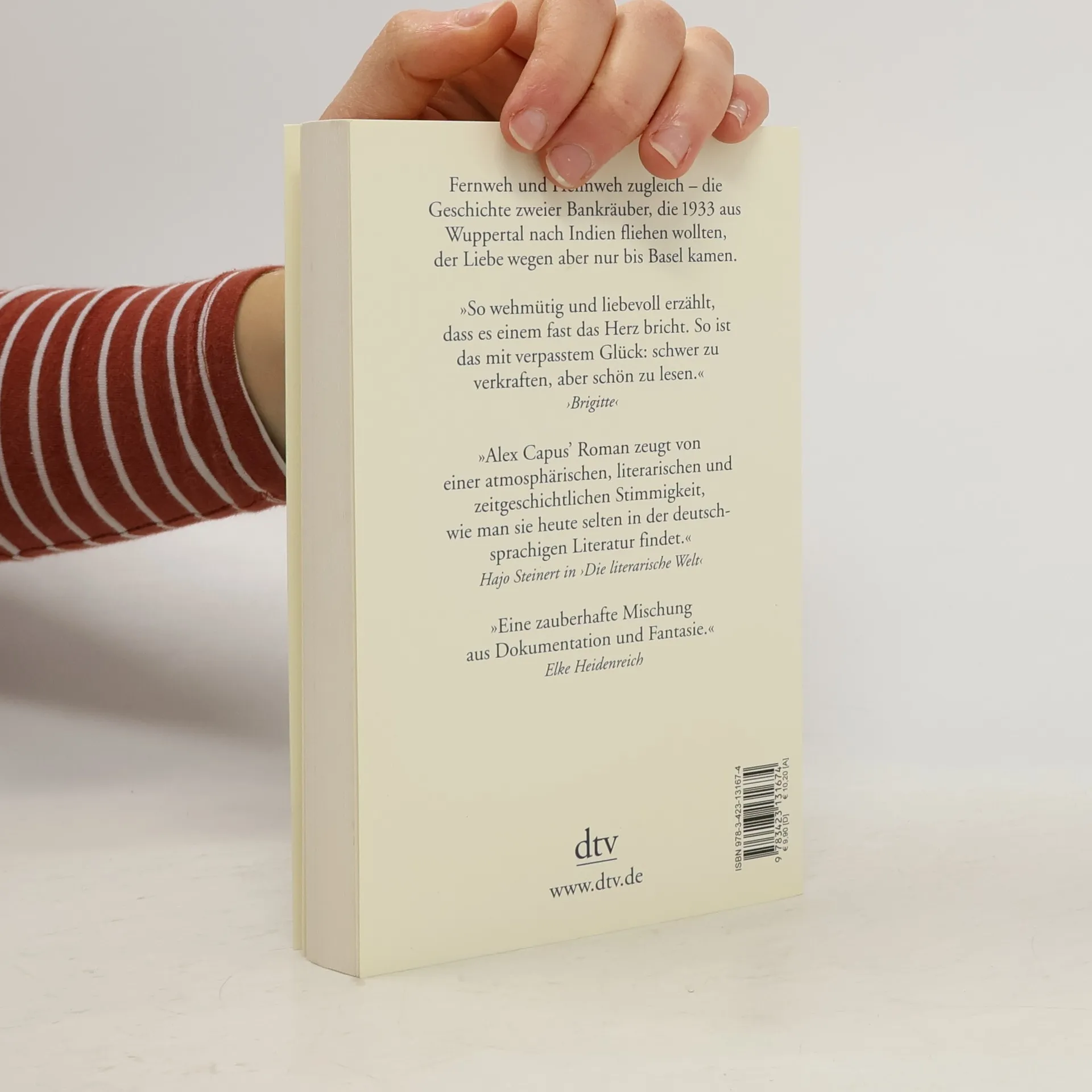 Fernweh und Heimweh zugleich – die Geschichte zweier Bankräuber, die 1933 aus Wuppertal nach Indien fliehen wollten, der Liebe wegen aber nur bis Basel kamen. Zwei arbeitslose Burschen, Kurt Sandweg und Waldemar Velte, suchten im Winter 1933 den Seeweg von Wuppertal nach Indien. Um sich das Reisegeld zu beschaffen, überfielen sie eine Bank, wobei sie versehentlich den Filialleiter erschossen. Auf der Flucht vor ihren Verfolgern kamen sie nicht sehr weit: In Basel verliebte Kurt Sandweg sich in die Schallplatten-Verkäuferin Dorly Schupp. Tag für Tag kauften er und sein Freund eine Tango-Platte, bis das Geld aufgebraucht war und der nächste Banküberfall nötig wurde. Abend für Abend gingen die drei am Rhein spazieren. Mit von der Partie war die junge Sportartikelverkäuferin Marie Stifter, die dreißig Jahre später die Großmutter des Erzählers wurde und die sich entscheiden musste zwischen einem Bankräuber und ihrem Verlobten. Platz 6 der SWR-Bestenliste im März 2002 Buch des Monats März 2002 in ›Literaturen‹