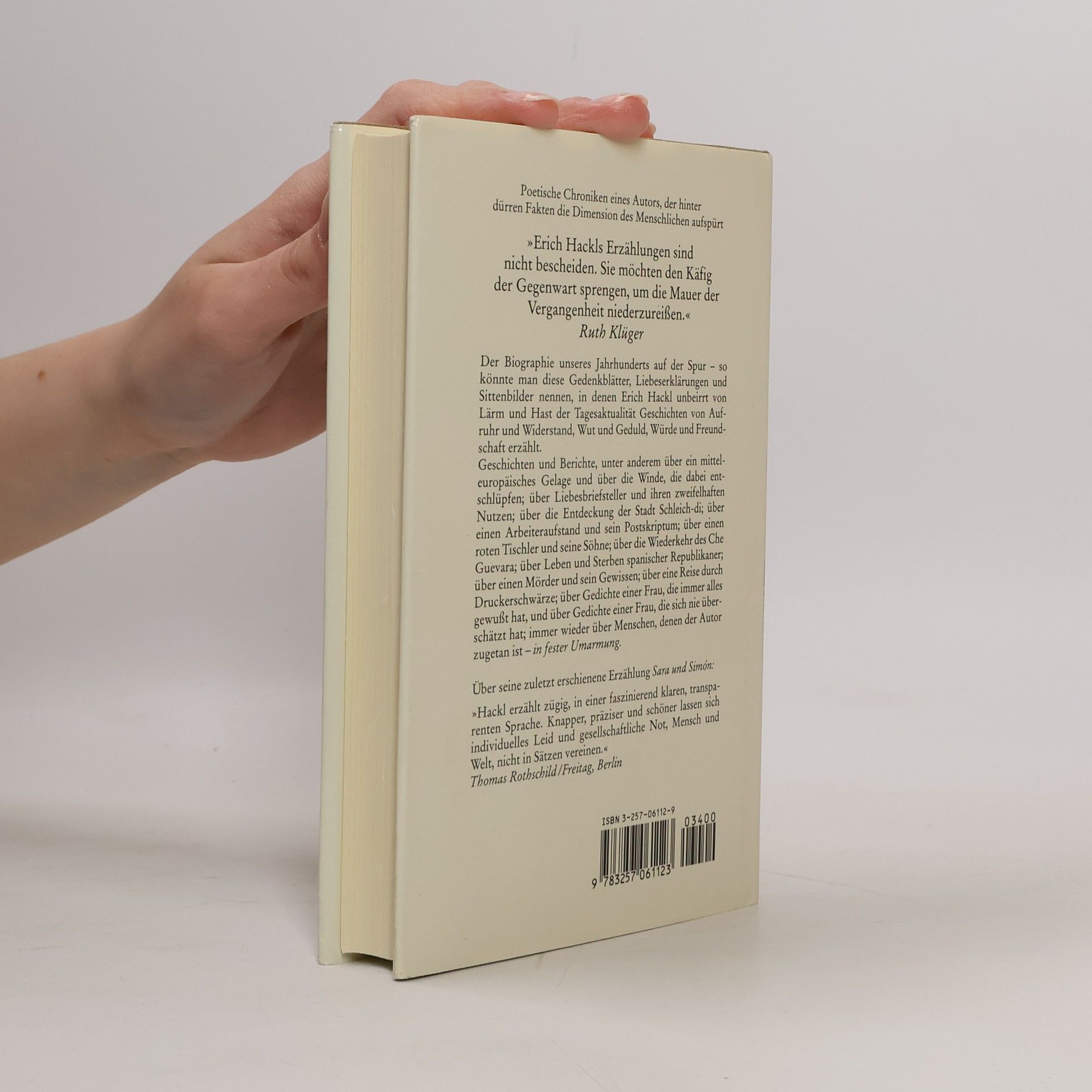 Geschichten und Berichte: über ein Gelage und über die Winde, die dabei entschlüpfen; über Liebesbriefsteller und ihren zweifelhaften Nutzen; über die Entdeckung der Stadt Schleich-di; über die Wiederkehr des Che Guevara; über Gedichte einer Frau, die immer alles gewußt hat, und über Gedichte einer Frau, die sich nie überschätzt hat; immer wieder über Menschen, denen der Autor zugetan ist – ›in fester Umarmung‹.
