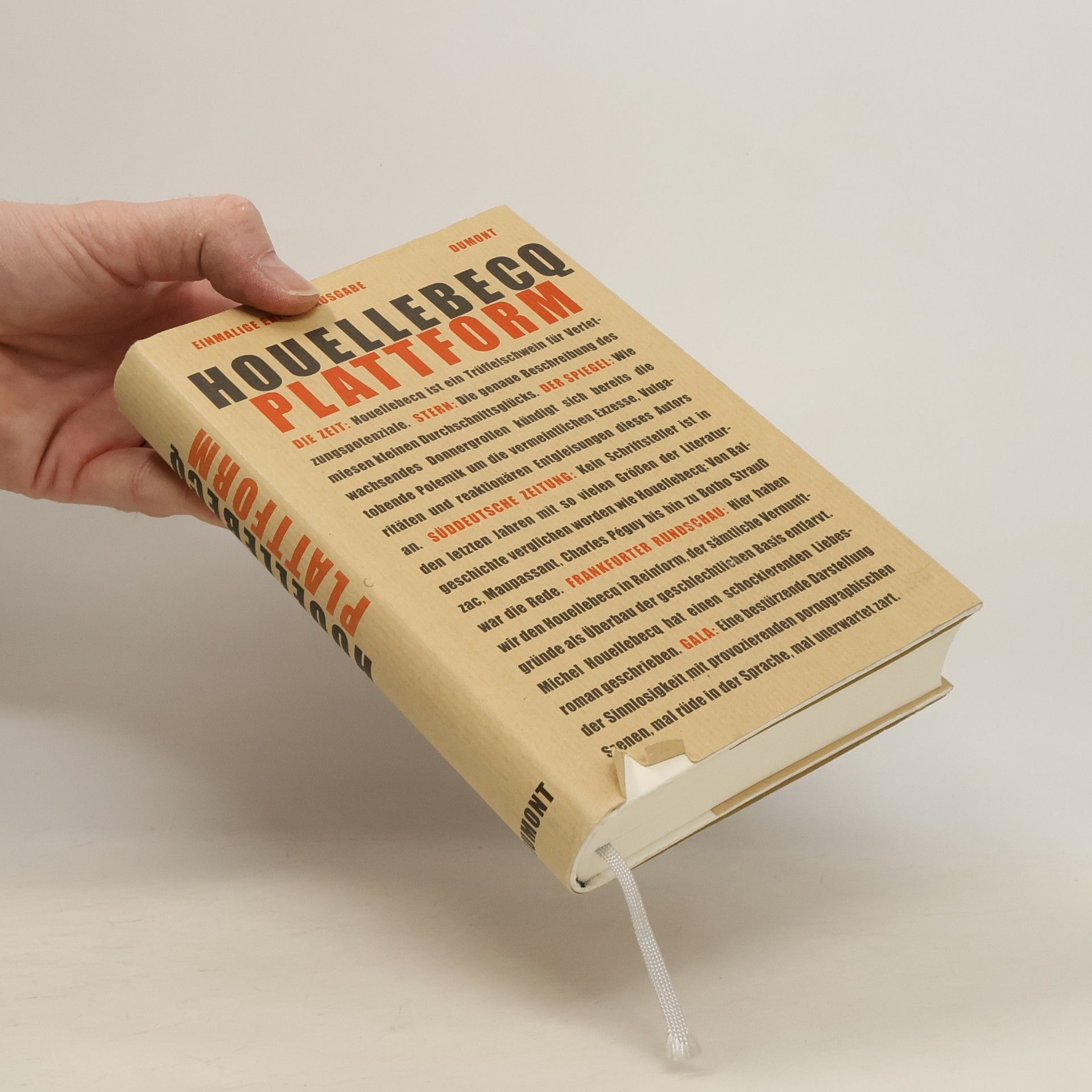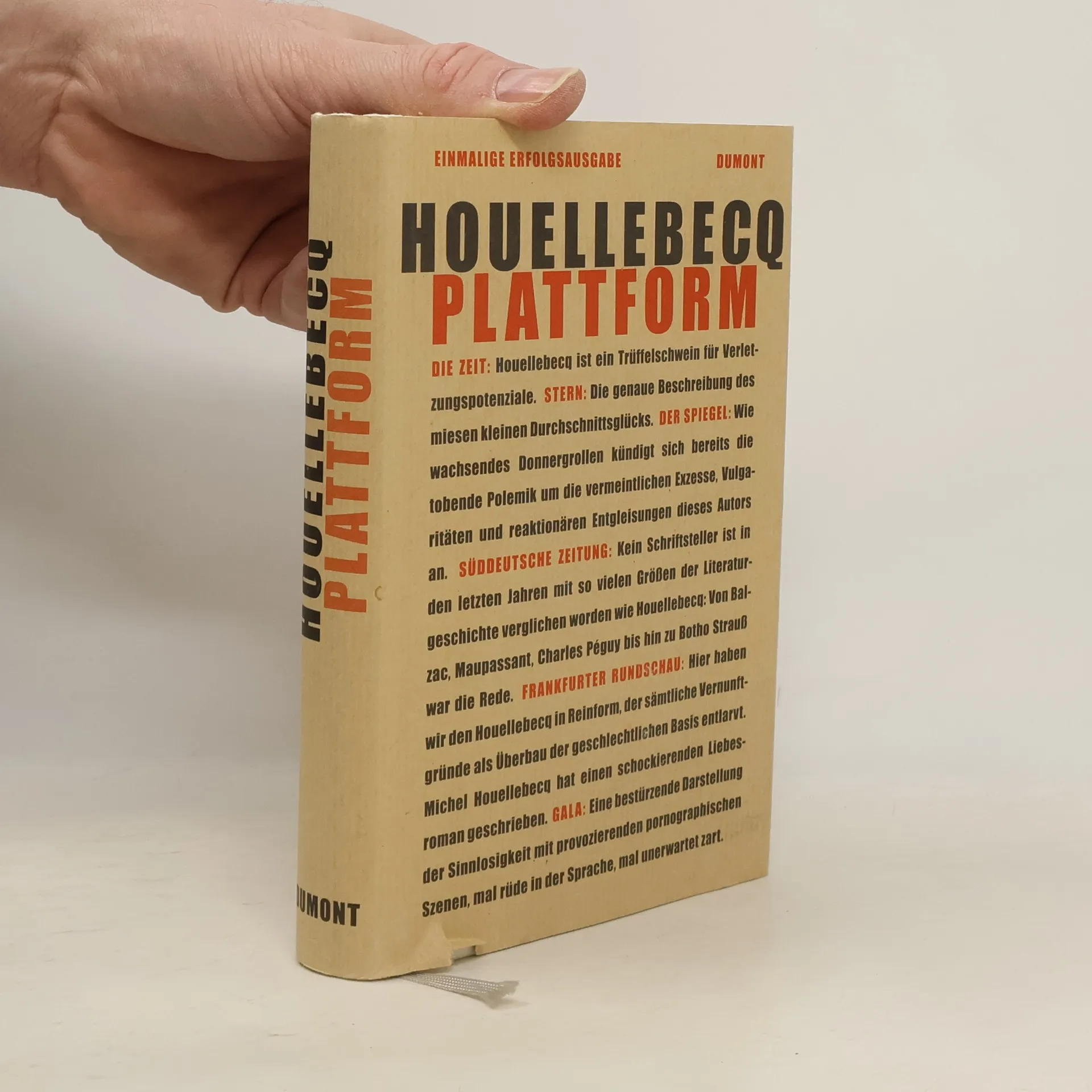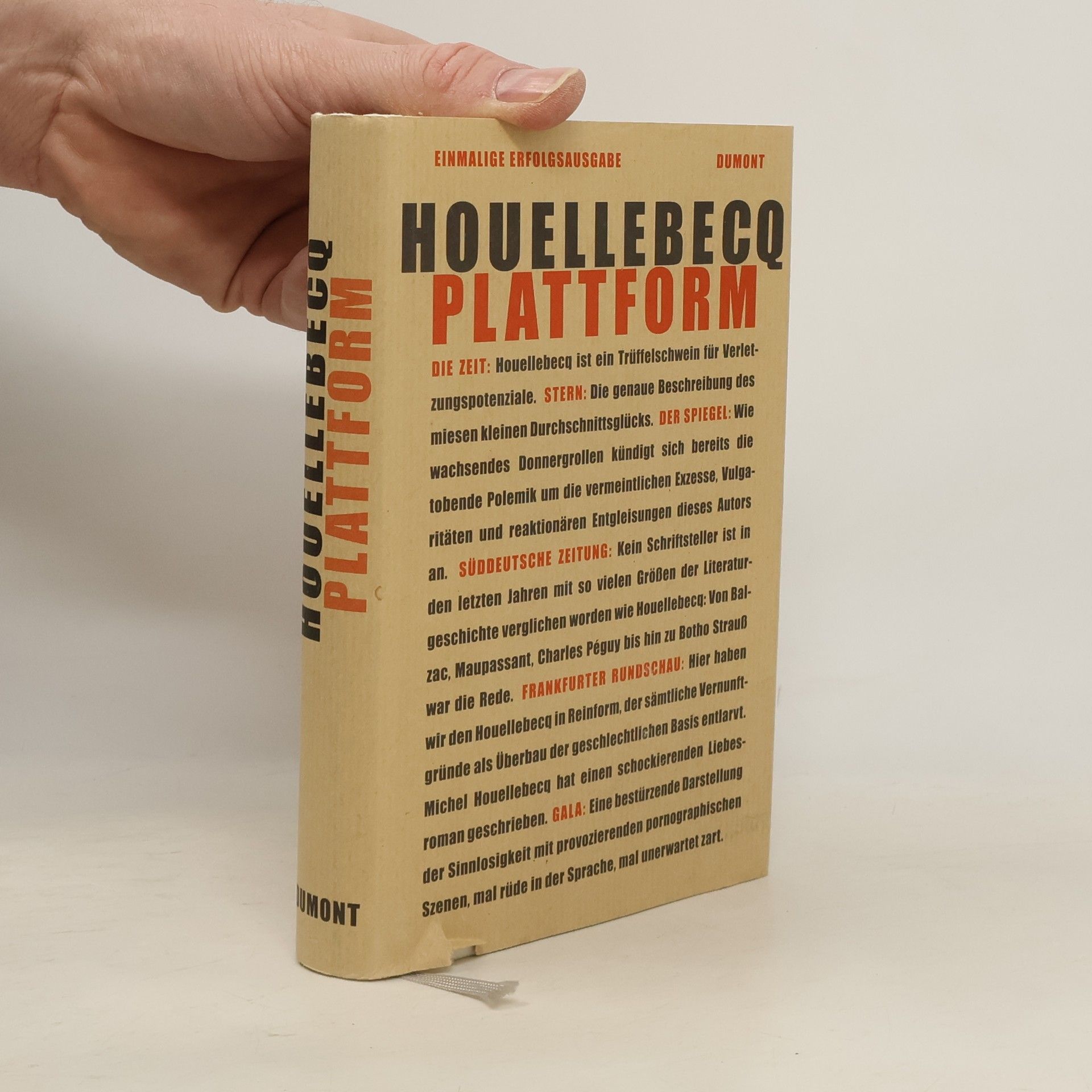"Plattform" protokolliert erbarmungslos ein Leben: Tristesse, Liebesglück und tragischen Tod. Der Erzähler Michel ist Beamter im Kultusministerium. Vierzig, farblos, frustriert und nach Dienstschluss einsamer Peep-Show-Erotomane und Experte im TV-Zappen. Die Urlaubspauschalreise ins Traumland Thailand verspricht diesem "ziemlich mittelmäßigen Individuum" paradiesisches Glück und Erlösung: Sexgenuss mit Asiatinnen. Die Mitreisende Valerie, eine erfolgreiche Managerin in der Tourismusindustrie, lernt er erst nach der Rückkehr ins lieblose Paris wirklich kennen - und mit ihr ein tiefes menschliches Glück voller Obsessionen, und ohne Bezahlung.§Zusammen erfinden Valerie und Michel ein rettendes Programm für die Reisebranche, die Plattform zum Glück: Wenn mehrere hundert Millionen alles haben, bloß kein sexuelles Glück, und mehrere Milliarden nichts haben als ihren Körper, dann ist das "eine Situation des idealen Tauschs". Michel und Valerie wollen die ver lorene Liebesfähigkeit des Westens in neuartigen Ferienclubs organisieren. Aber das gemeinsame Glück, nach dem Houellebecqs Erzähler Michel verzweifelt sucht, wird bei einem terroristischen Anschlag in Thailand von Islamisten zerstört.