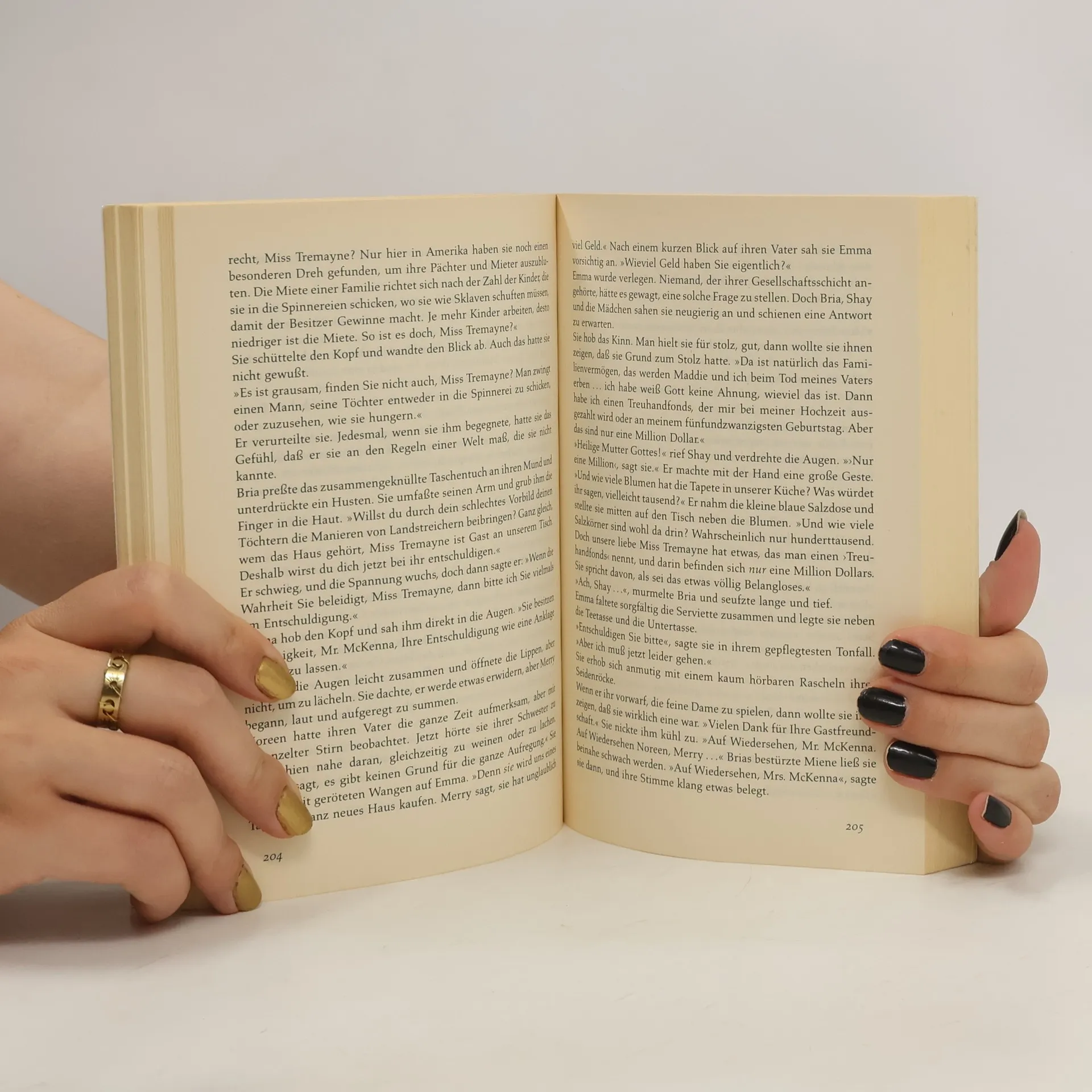 Schon seit einiger Zeit wartet die reiche und vornehme Emma Tremayne darauf, daß der junge Geoffrey Alcott, Besitzer einer großen Wollspinnerei in Bristol, um ihre Hand anhält. Jeder erwartet es, und jeder erwartet auch, daß Emma sich in ihrem Leben um nicht viel mehr kümmern wird als um die neueste Mode. Schließlich ist es soweit, Geoffrey bittet sie, seine Frau zu werden. Aber als Emma an diesem Tag mitansehen muß, wie er eine Frau schroff zurückweist, die ihr totes Kind in den Armen hält, daß in seiner Spinnerei durch einen Unfall gestorben ist, ändert sich ihr Leben von Grund auf. Sie bricht aus diesem unterkühlten goldenen Käfig aus. Endlich will sie leben und sie lernt Shay McKenna, einen irischen Revolutionär und Landarbeiter kennen, in den sie sich leidenschaftlich verliebt. Noch ahnt sie nicht, daß er zu Bria, der Frau gehört, die es gewagt hat, Geoffrey Alcott die Stirn zu bieten und ihr damit die Augen zu öffnen.
