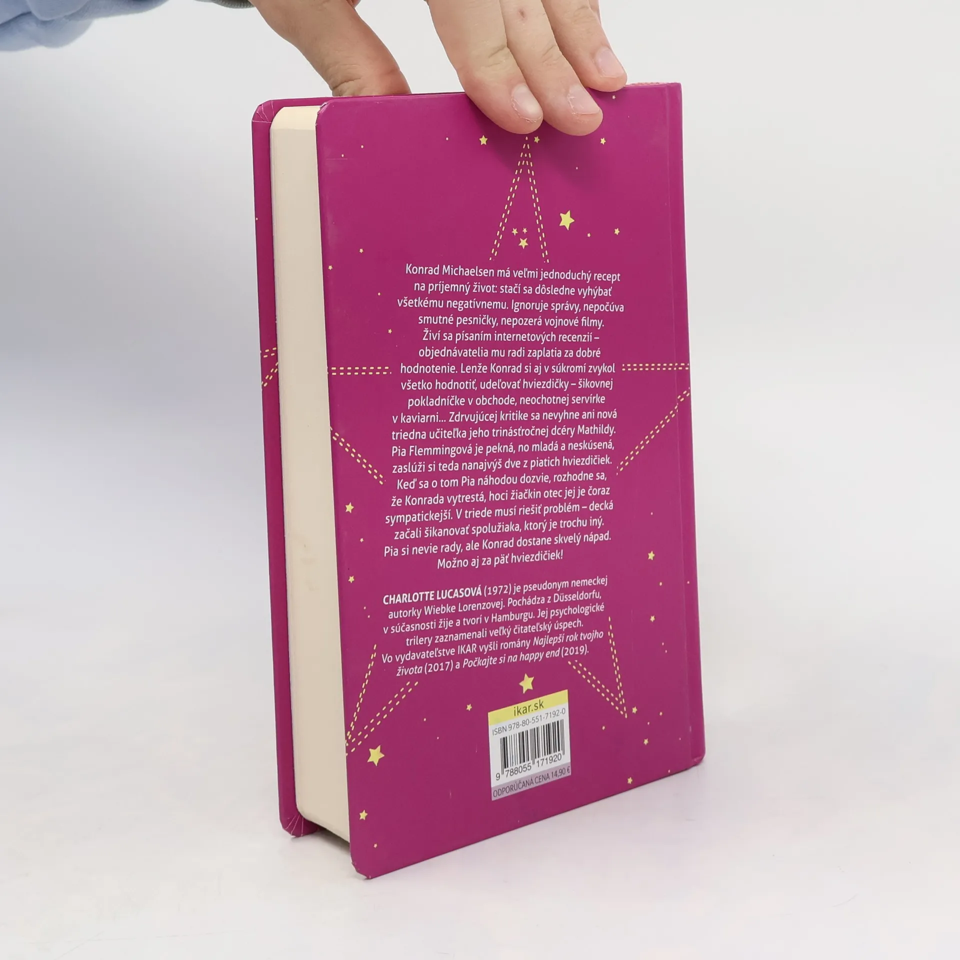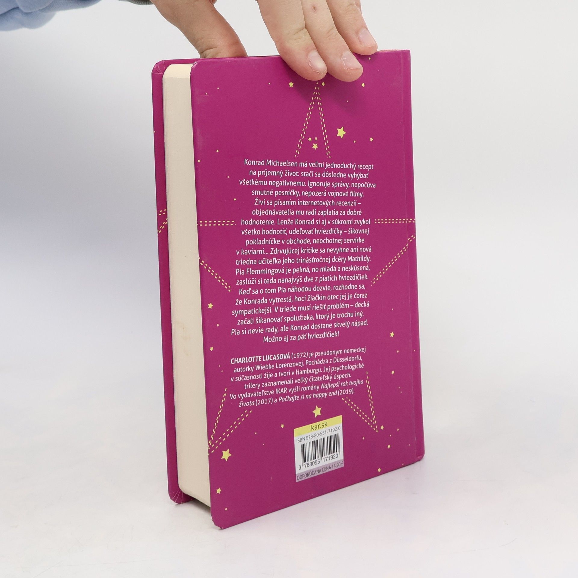 Konrad Michaelsen má veľmi jednoduchý recept na príjemný život: stačí sa dôsledne vyhýbať všetkému negatívnemu. Ignoruje správy, nepočúva smutné pesničky, nepozerá vojnové filmy. Živí sa písaním internetových recenzií – objednávatelia mu radi zaplatia za dobré hodnotenie. Lenže Konrad si aj v súkromí zvykol všetko hodnotiť, udeľovať hviezdičky – šikovnej pokladníčke v obchode, neochotnej servírke v kaviarni... Zdrvujúcej kritike sa nevyhne ani nová triedna učiteľka jeho trinásťročnej dcéry Mathildy. Pia Flemmingová je pekná, no mladá a neskúsená, zaslúži si teda nanajvýš dve z piatich hviezdičiek. Keď sa o tom Pia náhodou dozvie, rozhodne sa, že Konrada vytrestá, hoci žiačkin otec jej je čoraz sympatickejší. V triede musí riešiť problém – decká začali šikanovať spolužiaka, ktorý je trochu iný. Pia si nevie rady, ale Konrad dostane skvelý nápad. Možno aj za päť hviezdičiek!