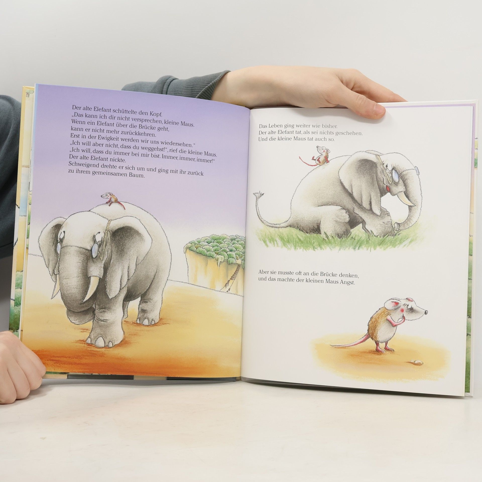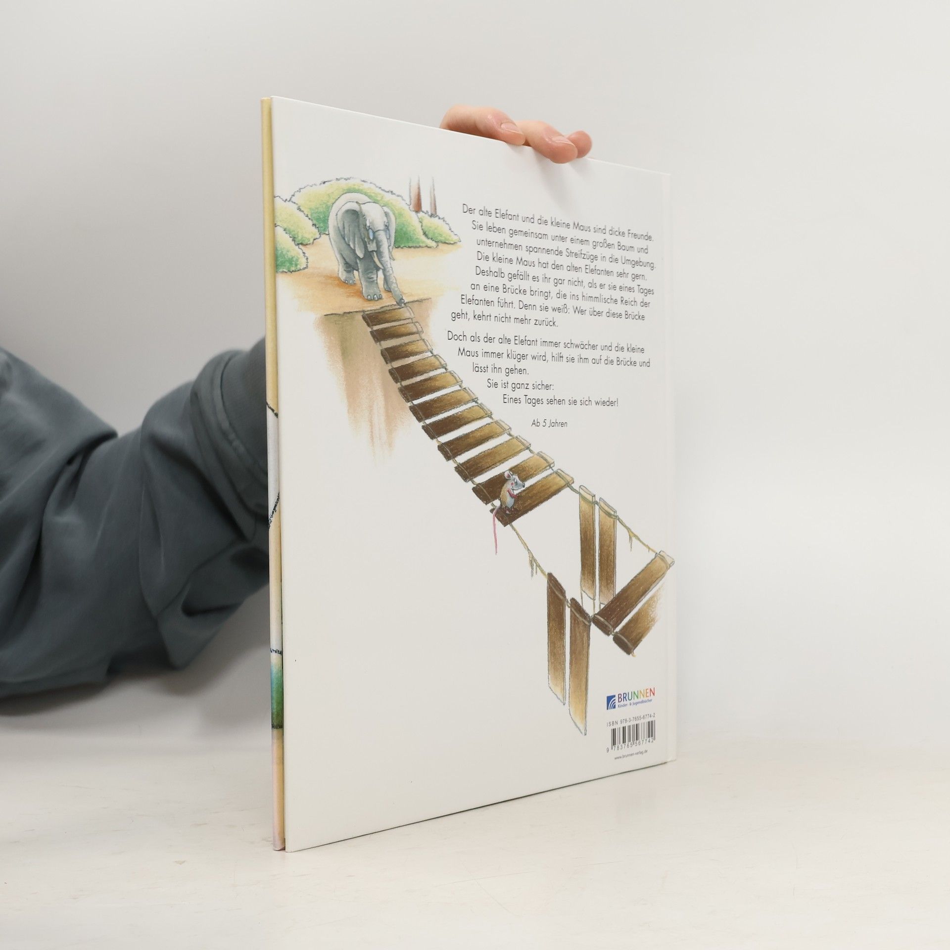 Auch der Tod gehört zum Leben: Die kleine Maus und der alte Elephant sind dicke Freunde. Sie wohnen unter einem Baum und helfen einander: Die kleine Maus flicht eine Kordel, damit der Elefant die Brille nicht immer verlegt, und er trägt sie zu den schönsten Orten hin. Eines Tages bringt er sie zu einer Brücke. Die führt über eine tiefe Schlucht zum himmlischen Reich, wo alle Elefanten glücklich sind. Der kleinen Maus gefällt das gar nicht und deshalb ist sie ganz froh, dass die Brücke kaputt ist. Denn keiner, der über die Brücke geht, kann zurückkommen und sie will, dass der alte Elefant immer bei ihr bleibt! Die Jahre vergehen und der Elefant kann kaum mehr etwas sehen und hören. Zuletzt mag er auch nicht mehr essen. Da merkt die Maus, dass sie ihn gehen lassen muss. Sie selber flickt die Brücke, damit sie den schweren Elefanten trägt. Irgendwann werden sie sich wieder sehen, für immer und ewig. Eine warmherzige, poetische Geschichte, die Kindern helfen kann, Tod und Sterben als einen Teil des Lebens zu akzeptieren, die aber auch Hoffnung vermittelt, über den Tod hinaus. Ein kurzer Einstieg gibt auch Eltern etwas zu diesem schwierigen Thema in die Hand. Ab 5 Jahren, ausgezeichnet, Irene Beglinger-Flückiger.