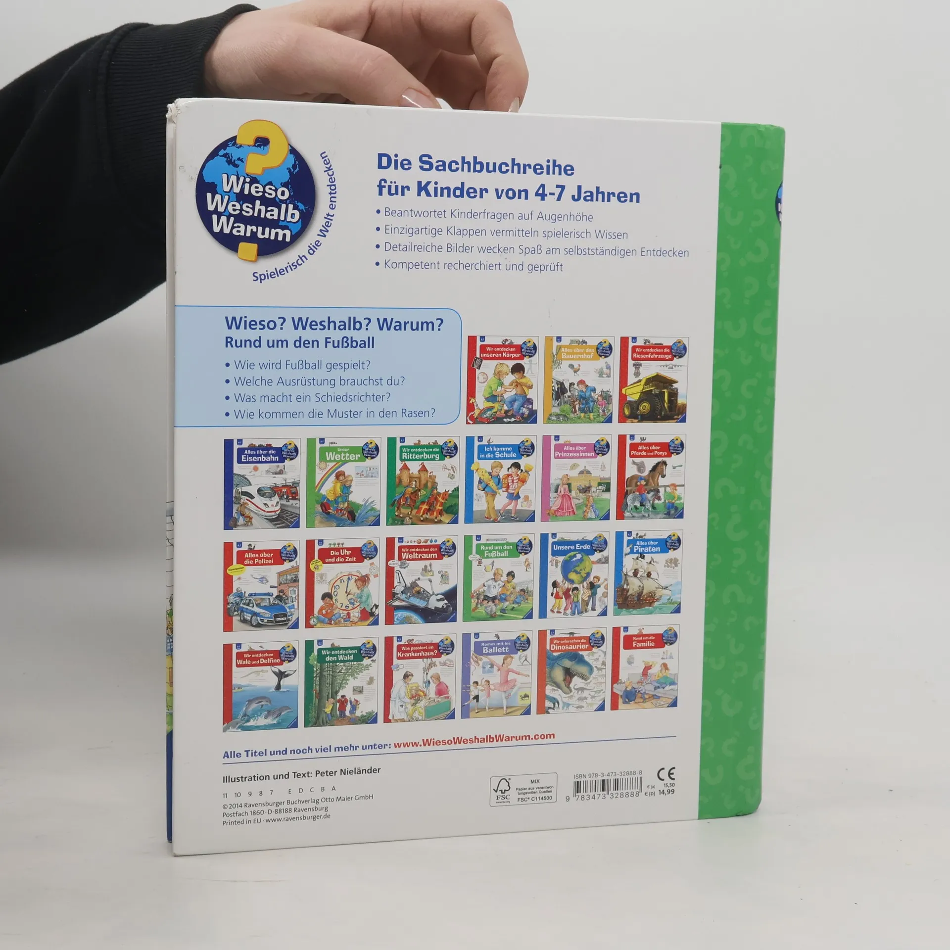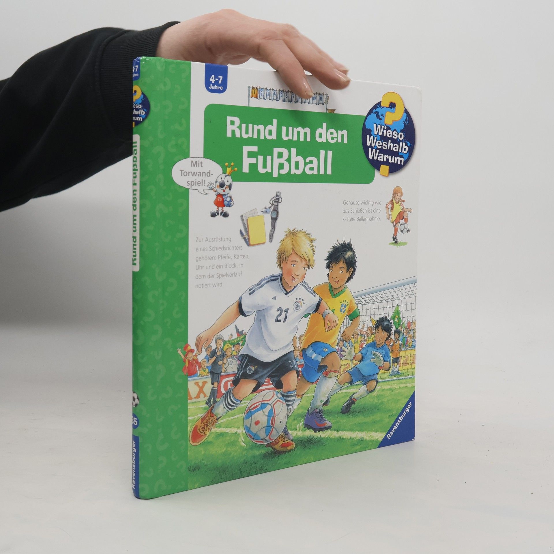 Tor, Tor, Toooor! Dieses Buch lässt die Herzen junger Kicker höherschlagen und ist der perfekte Begleiter für aufregende Turniere wie die Fußballweltmeisterschaft. Kindgerecht und unterhaltsam beantwortet es die wichtigsten Fragen über das runde Leder: Wann gibt es die Rote Karte? Wie dribbeln die Profis? Welche Turniere und Pokale gibt es zu gewinnen? Spielspaß für die Halbzeitpause ist dank des integrierten Torwandspiels garantiert. Wieso? Weshalb? Warum? Die Sachbuchreihe für Kinder von 4–7 Jahren Jeden Tag entdecken Kinder etwas Neues – da kommen viele Fragen auf. Warum sind die Dinosaurier ausgestorben? Wo ist die Sonne in der Nacht? Wozu brauchen wir das Blut? Die beliebte Sachbuchreihe Wieso? Weshalb? Warum? gibt Kindern Antworten auf Augenhöhe. Dabei werden die unterschiedlichsten Themen aus der Alltags- und Interessenswelt der Kinder altersgerecht und mit viel Liebe zum Detail unter die Lupe genommen. Detailreiche Bilder, verständliche Sachtexte und überraschende Klappen, die Bewegungen oder Abläufe veranschaulichen und hinter die Dinge blicken lassen, ermöglichen Kindern, sich ihre Themen selbst zu erschließen. Der Spaß am eigenhändigen Entdecken, die liebevolle Umsetzung und die qualitativ hochwertige Ausstattung garantieren langanhaltende Freude an jedem einzelnen Buch.