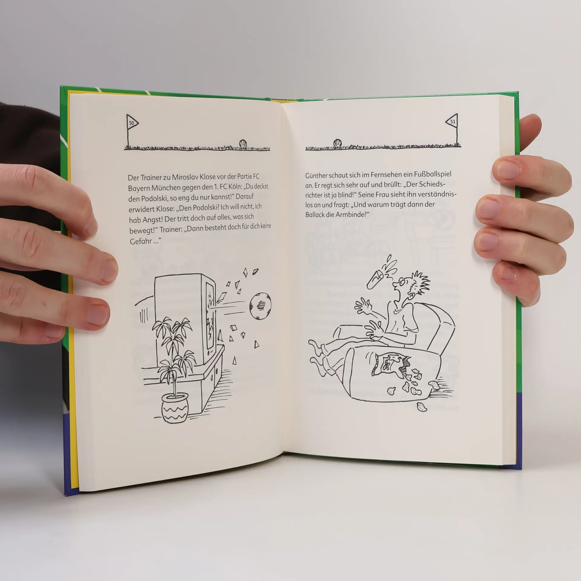Die ultimative Witzesammlung für alle Fußballbegeisterten oder solche, die es werden wollen. Ob jung oder alt, Mann oder Frau: Zum Selberlachen, Weitererzählen oder Mitreden! Der Fußballer ist gefoult worden und humpelt nun mit schmerzverzerrtem Gesicht auf dem Spielfeld herum. Da meint der Trainer zum Vereinsmasseur: „Bei dem weiß man nie, ob man den Doktor oder den Theaterkritiker kommen lassen soll.“ Witzige Illustrationen attackieren die Bauchmuskeln zusätzlich: Zum Schießen!