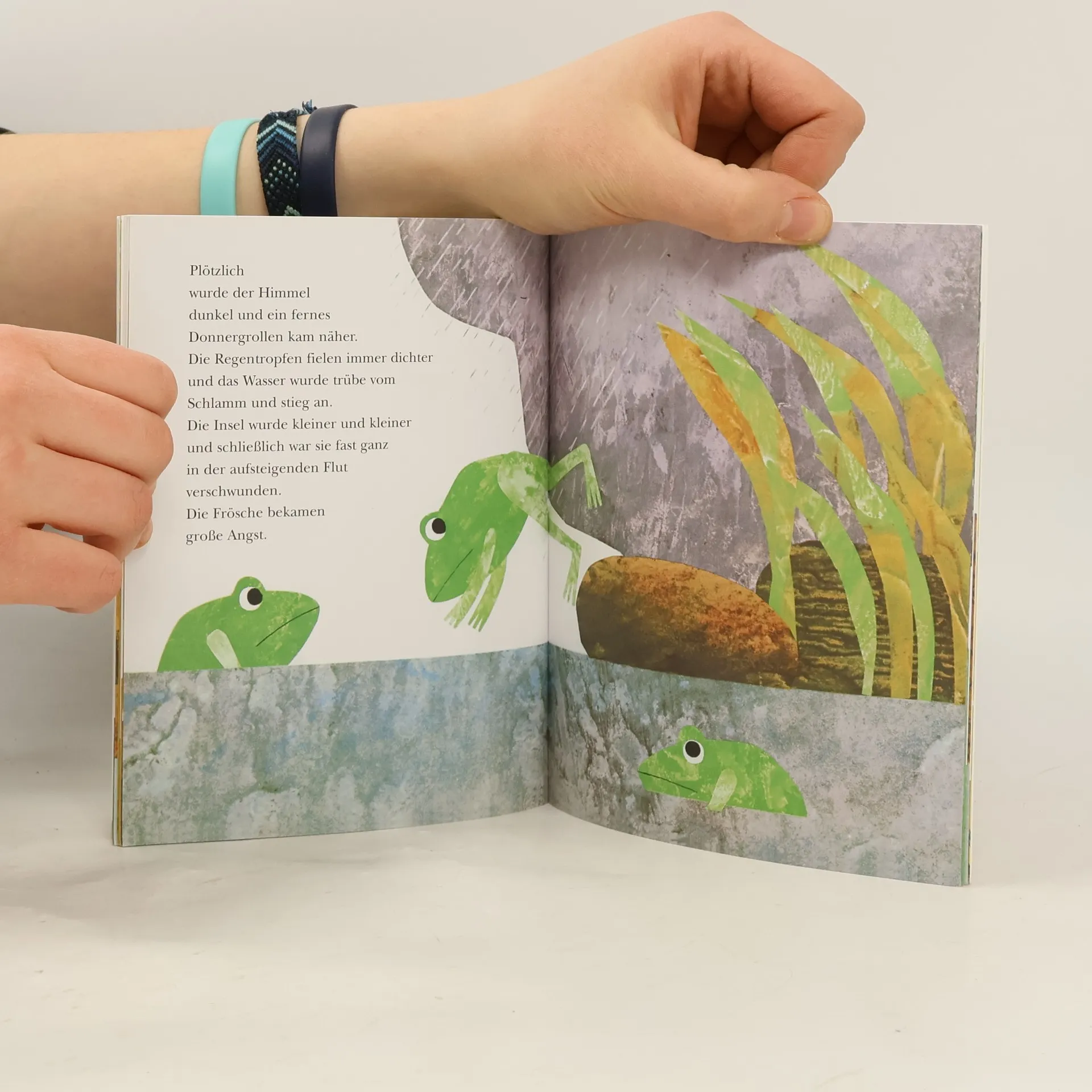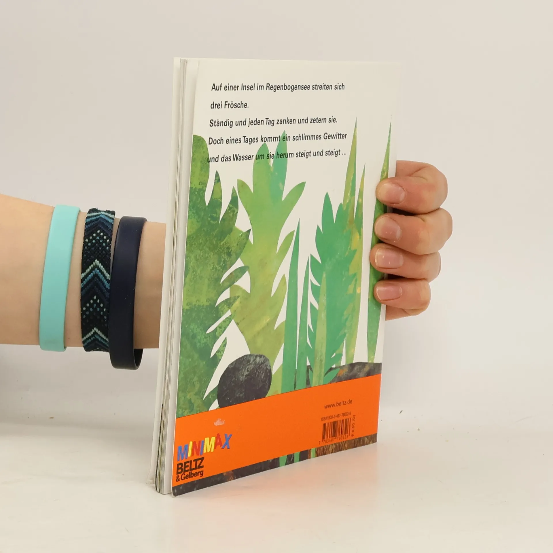 "Ich muss mir den ganzen Tag euer Geschrei anhören: 'Das gehört mir, das gehört mir!' Es gibt keinen Frieden hier, weil ihr euch ewig streitet. Das kann nicht so weitergehen." Auf einer Insel im Regenbogensee streiten sich drei Frösche. Ständig und jeden Tag zanken und zetern sie. Einer dicken Kröte geht der ewige Streit in der Nachbarschaft auf die Nerven. Doch dann kommt eine große Flut und zwingt alle näher zusammenzurücken.